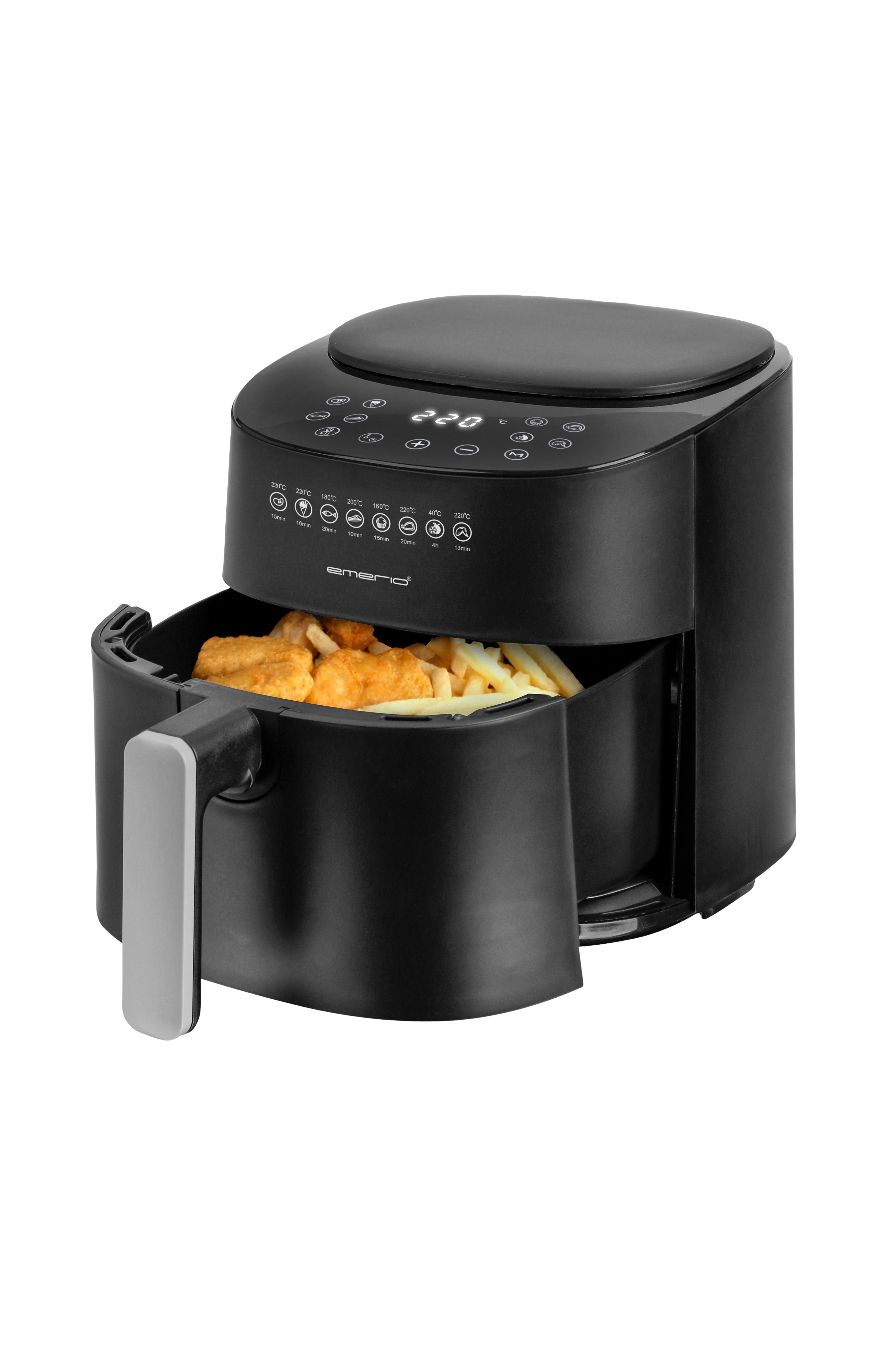 Emerion digitaalisessa ilmakäristimessä on tyylikäs muotoilu ja digitaalinen näyttö, jonka avulla voit helposti säätää lämpötilan ja ajastimen asetukset täydellisesti kypsennettyä ruokaa varten. Sisäänrakennettu signaali kertoo, kun ruoka on valmista. Eri ainesosille on myös esiasetetut ohjelmat, jotka helpottavat ruoan valmistusta. Paistinpannussa on kumijalat vakaata sijoittamista varten, koneessa pestävät osat ja irrotettava kori.