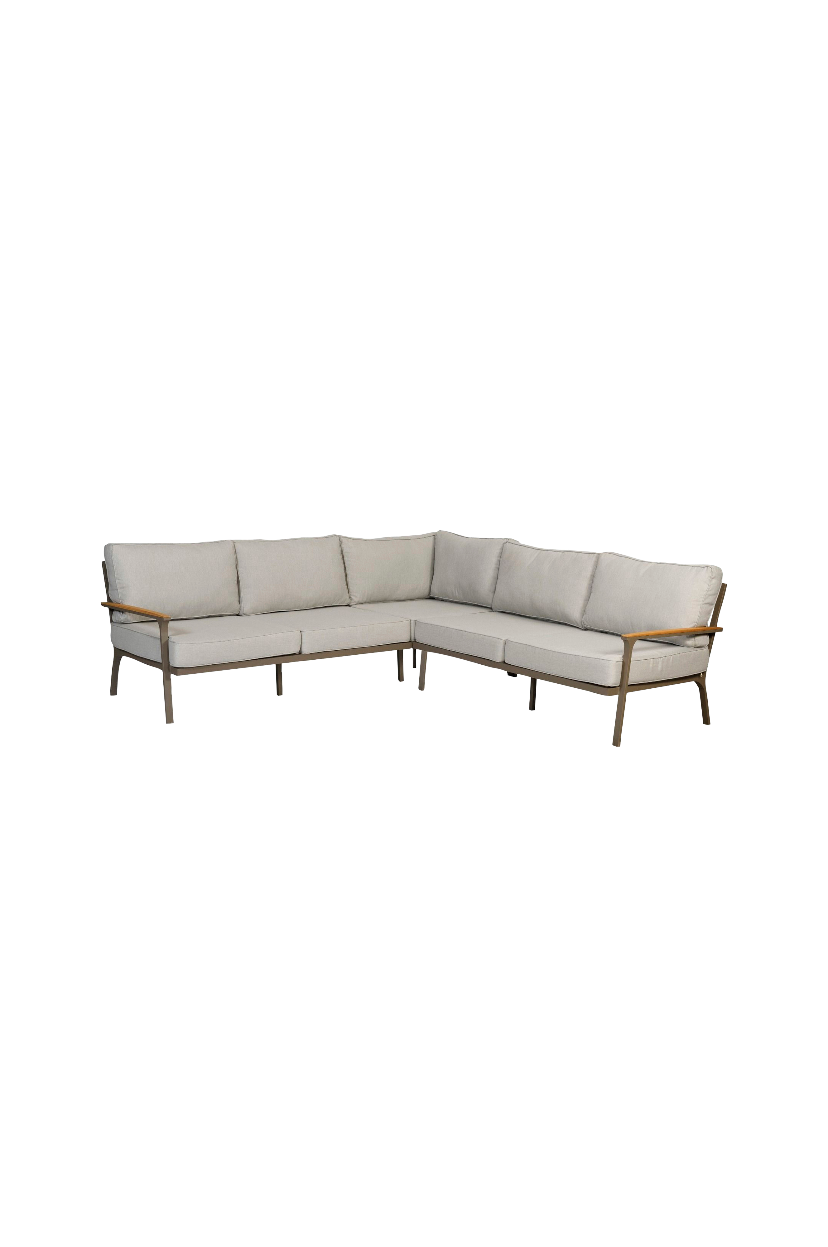 Rentoudu mukavassa Orlando-kulmasohvassa. Sohvan runko on alumiinia ja käsinojat FSC®-sertifioitua tiikkiä. Kulmasohvassa on kauniit ja mukavat pehmusteet, joissa on Olefin-kangaspäällinen ja nopeasti kuivuva vaahtomuovitäyte. Vaahtomuovi läpäisee vettä ja ehkäisee hometta ja lahoamista. Voit siis jättää tuotteen turvallisesti ulos koko puutarhakalustesesongin ajaksi.