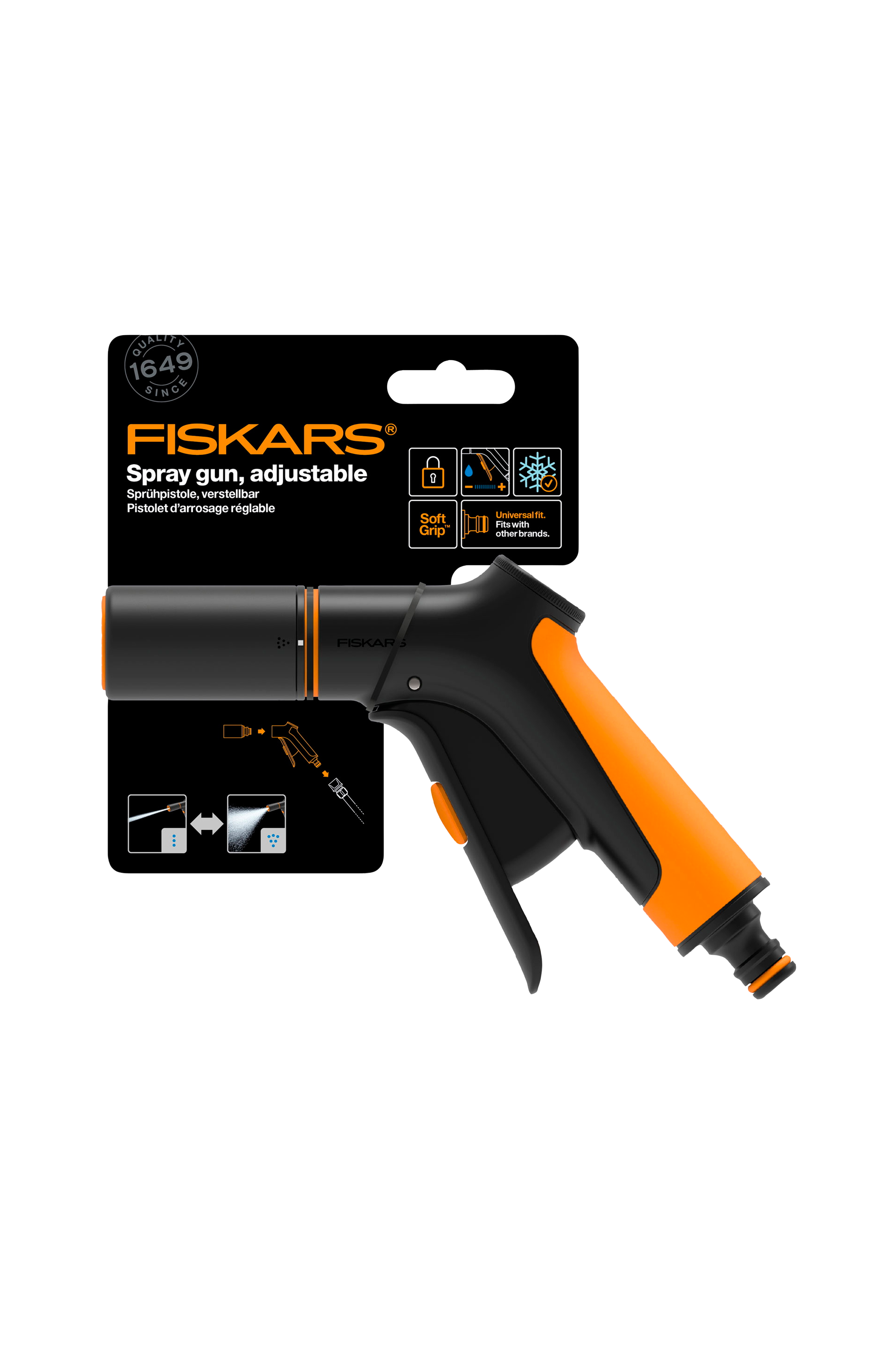 Fiskarsin säädettävä ruiskupistooli on ergonomisesti muotoiltu ja helppokäyttöinen, mikä helpottaa kastelua.