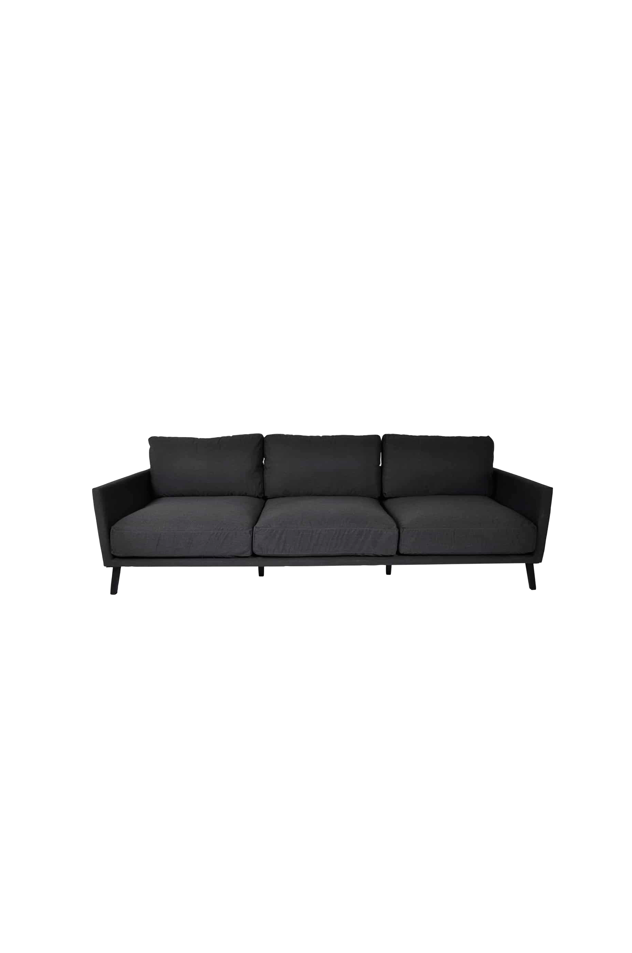 3-istuttava sohva Sunbrellan spun-dyed-akryylitekstiilistä, joka on vettähylkivää ja kestää ulkona sekä sateessa että lumessa. Istuttava 30 min sateen jälkeen. Materiaali: täyte: quickdry-vaahtomuovi ulkokangas: 100% kehrätty-värjätty dralon/akryyli alarunko: alumiini pesuohjeet: vesi (vaikeammat tahrat astianpesuaine) mitat: l240 d82 h80cm