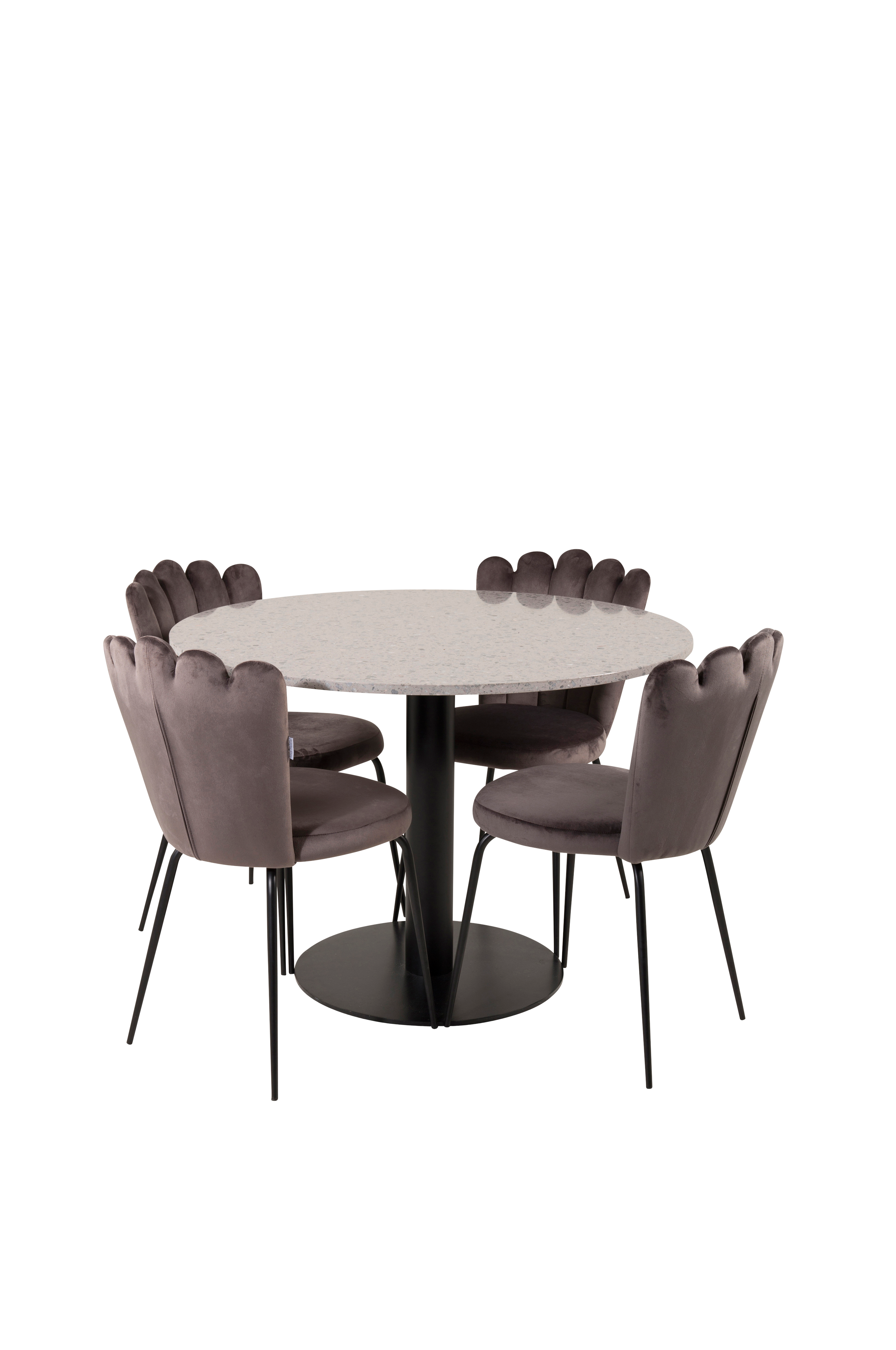 Venture Design Ruben-ruokapöytä, jossa pyöreä Terrazzo-pöytälevy ja metallijalat. Pöydän mitat: Halkaisija: 106 cm Korkeus: 75 cm. Neljä Furniture Fashion Limhamn -tuolia, joissa samettipäällinen ja metallijalat. Tuolin mitat: Kokonaiskorkeus: 82,5 cm, leveys: 44,5 cm, syvyys: 54 cm, istuinkorkeus: 48 cm. Pöytä ja tuolit on helppo koota.
