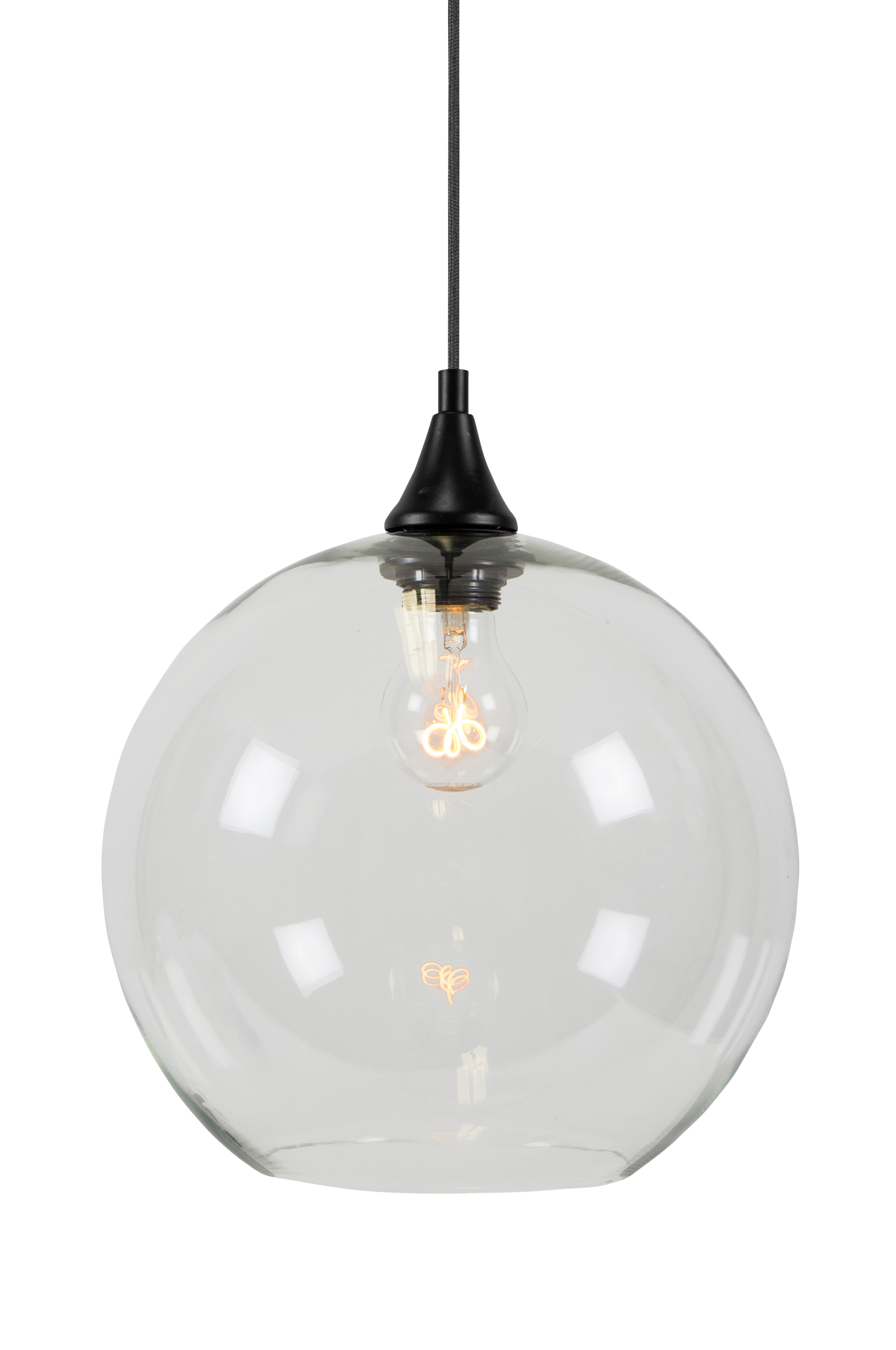 Valaisin kirkasta lasia, detaljit mattamustaa metallia. 120 cm:n musta kangasjohto, jossa kattokuppi. Halkaisija 28 cm, korkeus 32 cm. Lampunpidike E27, enintään 60 W.