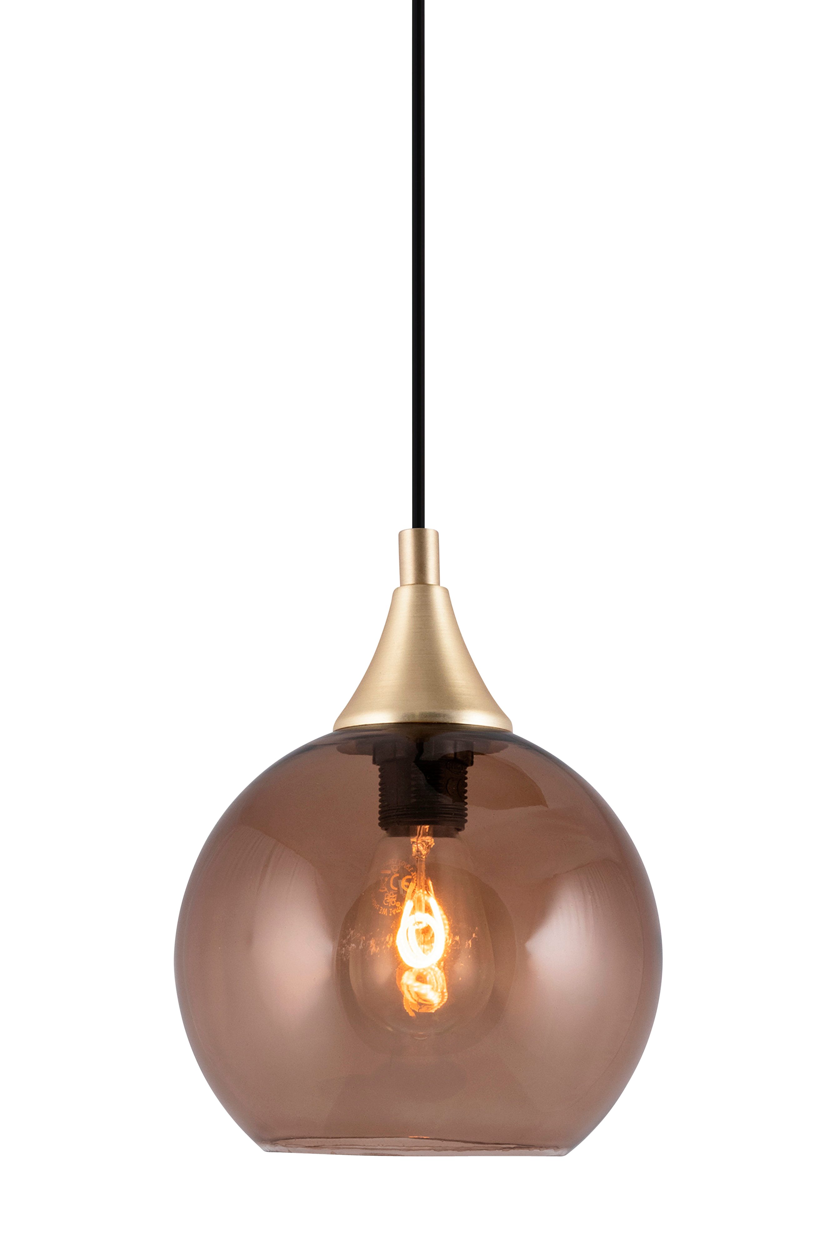 Pieni riippuvalaisin, jonka kupu ruskeaa lasia ja yksityiskohdat harjattua messinkiä. 350 cm:n musta kangasjohto, jossa katkaisin ja pistoke. Leveys 15 cm, syvyys 15 cm ja korkeus 18 cm. Lampunpidike 1 x E14. Enintään 40 W. Valonlähde ei sisälly toimitukseen.