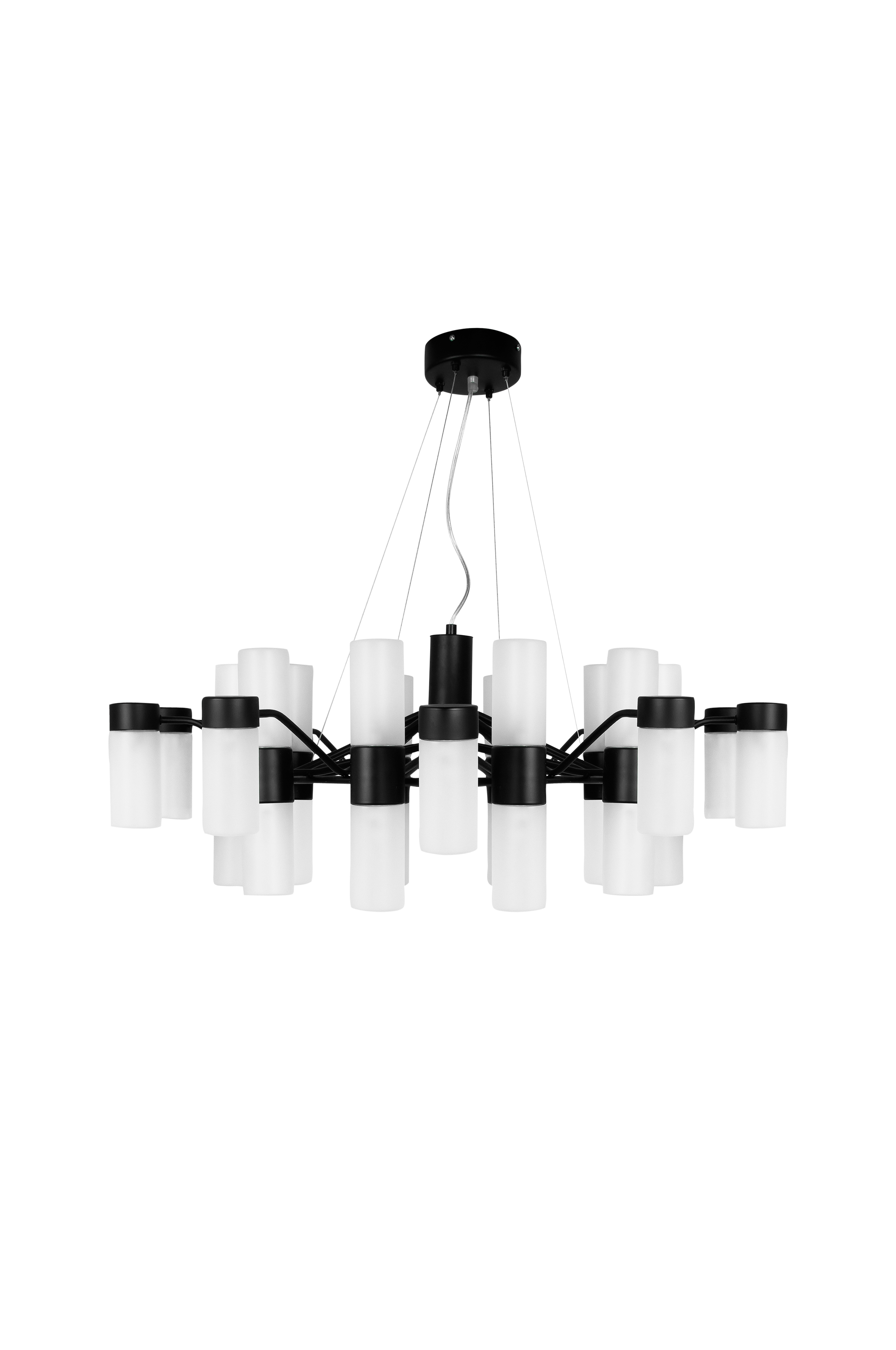 Näyttävä Santa Maria -kattokruunu on kaunis katseenvangitsija katossa. Valaisin on valmistettu maalatusta metallista ja sisältää 30 huurrelasikupua, joiden läpi kauniit valonlähteet näkyvät, kun valaisin sytytetään. Lasikuvuissa on kierteet. Kuvut on helppo asentaa, kun valonlähteet ovat paikallaan. Tukeva valaisin pysyy paikallaan neljällä vaijerilla, joiden korkeus on säädettävissä. Vaijereiden ja läpinäkyvän johdon pituus 250 cm. Musta kattokuppi. Kruunupistoke kattoliitäntään ei sisälly toimitukseen. Suunnittelija: Roger Persson. Halkaisija 90 cm ja korkeus 32 cm. Lampunpidike: 30 x G9, enintään 28 W. Valonlähde ei sisälly toimitukseen. Maadoitettu.