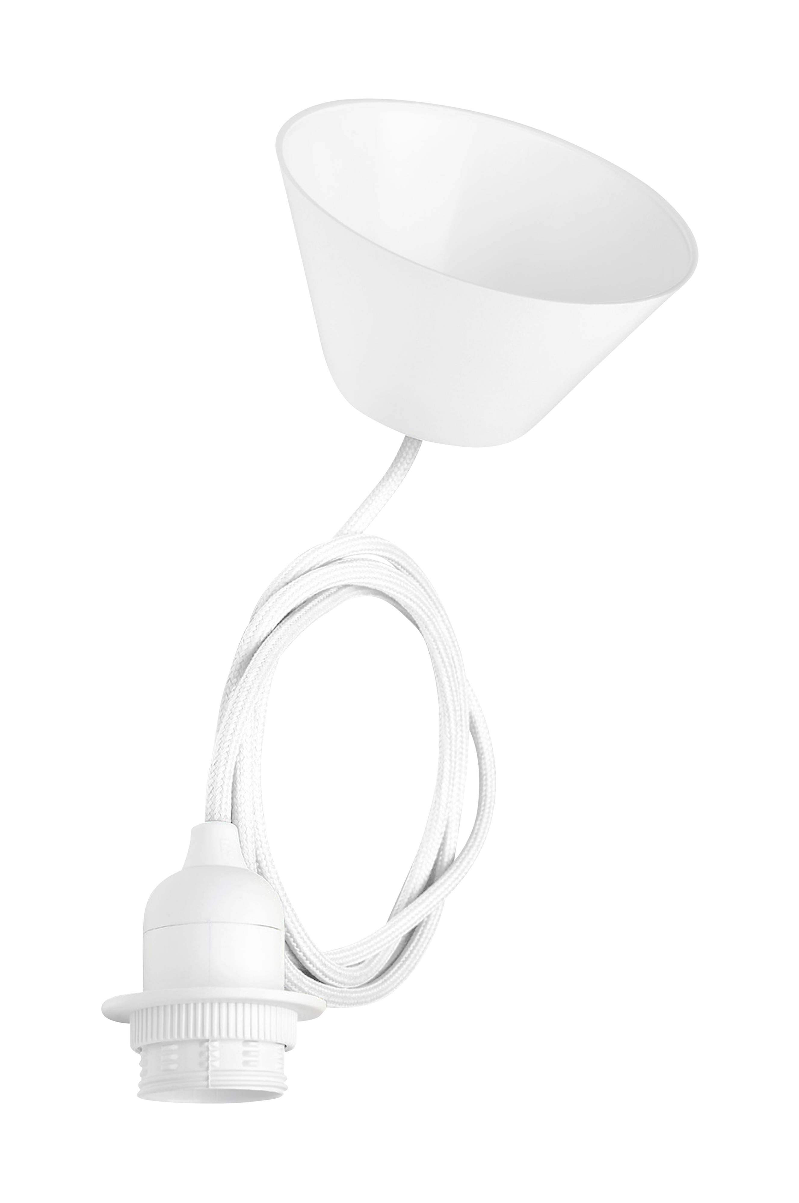 Ripustussarja, jossa 120 cm pitkä valkoinen kangasjohto, valkoinen kattokuppi ja valkoinen lampunpidike, jossa rengas. Yhdistä ripustussarja haluamaasi lampunvarjostimeen, jossa on E27-rengaskiinnike. Ripustussarja sopii himmentimeen, kattoliitäntään sopiva lampun pistoke myydään erikseen. Lampunkanta: 1xE27, 60 W.
