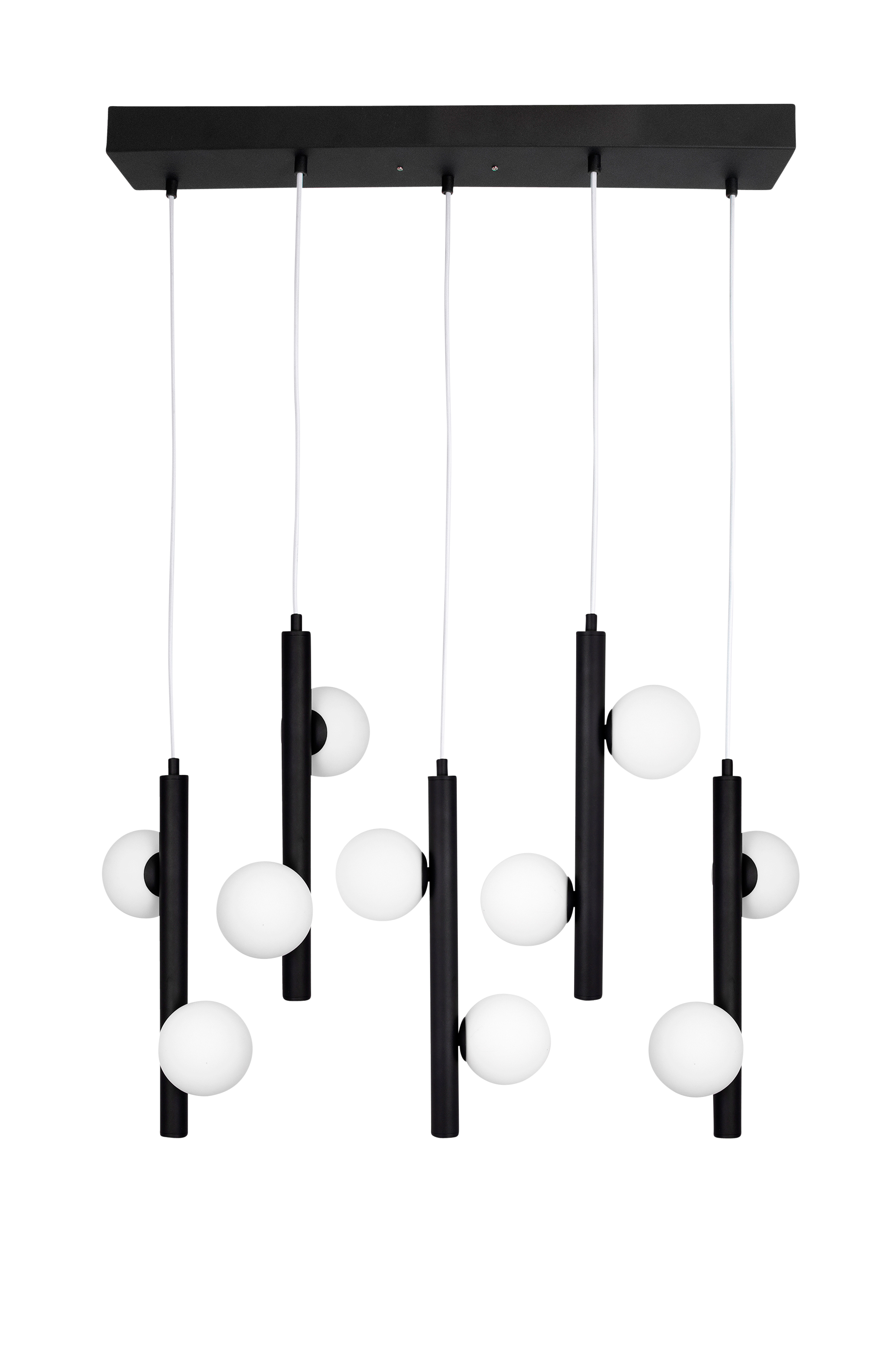Leveä kattovalaisin jauhemaalattua metallia. Helmiä muistuttavat mattavalkoiset lasikuvut. Lasikuvuissa on kierteet. Kuvut on helppo asentaa, kun valonlähteet ovat paikallaan. Limittäin menevät lamput kahdessa rivissä muodostavat lisäulottuvuuden valaisimen ilmeeseen. Säädettävä johdon pituus mahdollistaa lamppujen ripustamisen riviin tai eri tasoille toivomasi ilmeen mukaan. Pearl sopii erinomaisesti pitkän ruokapöydän tai keittiösaarekkeen ylle kauniiksi sisustuselementiksi. Kangasjohtojen pituus 120 cm, kattokuppi mattamustaksi jauhemaalattua metallia, kruunupistoke kattoliitäntään ei sisälly toimitukseen. Suunnittelija: GL Design Studio. Leveys 75 cm, syvyys 22,5 cm ja korkeus 143 cm. Lampunpidike: 10 x G9, 28 W. Valonlähde ei sisälly toimitukseen. Maadoitettu.