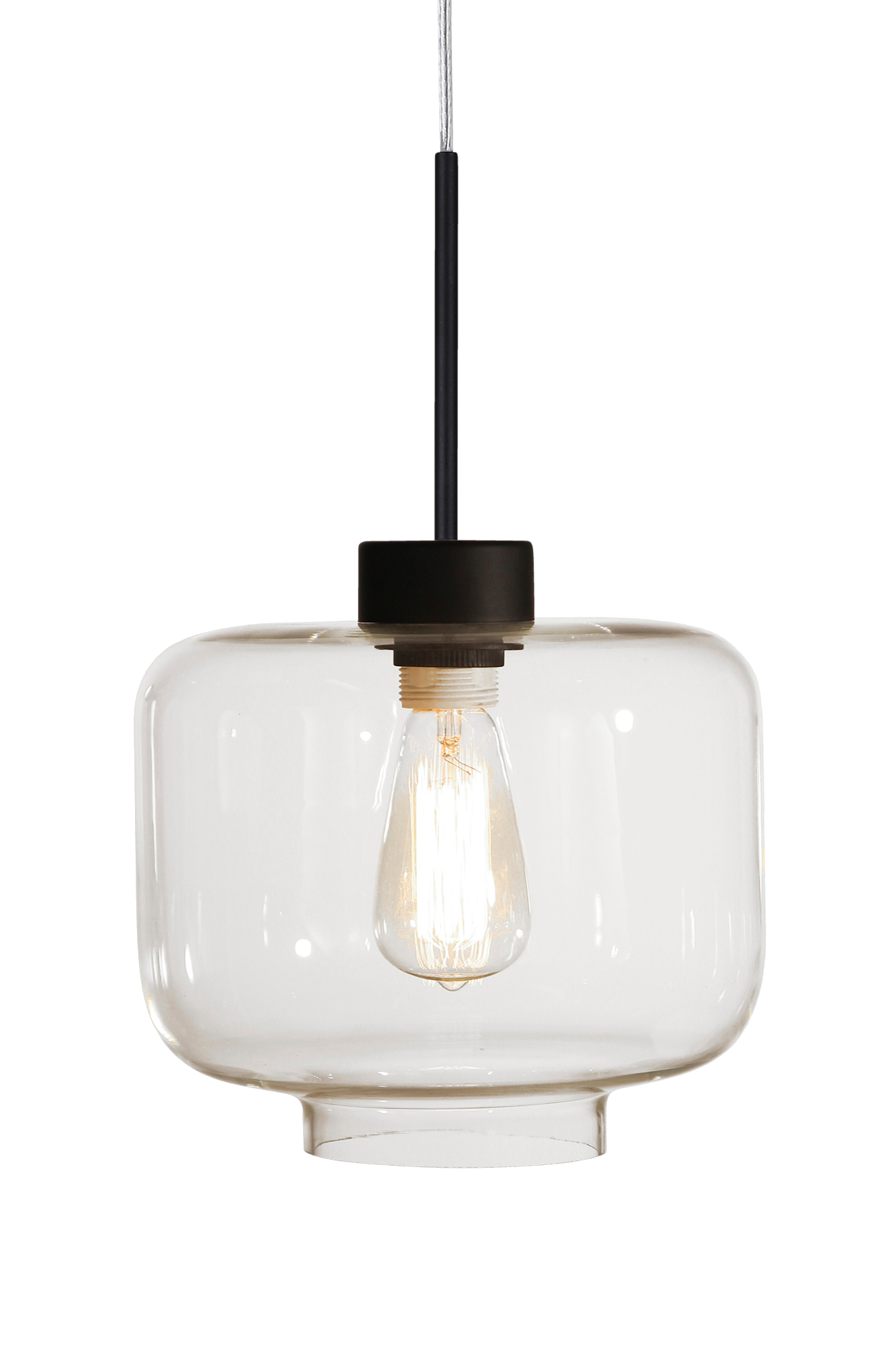 Lasia. Mattamusta lampunpidike ja läpinäkyvä johto. Korkeus 22 cm. Halkaisija 25 cm. Lampunpidike E27. Enintään 60 W.