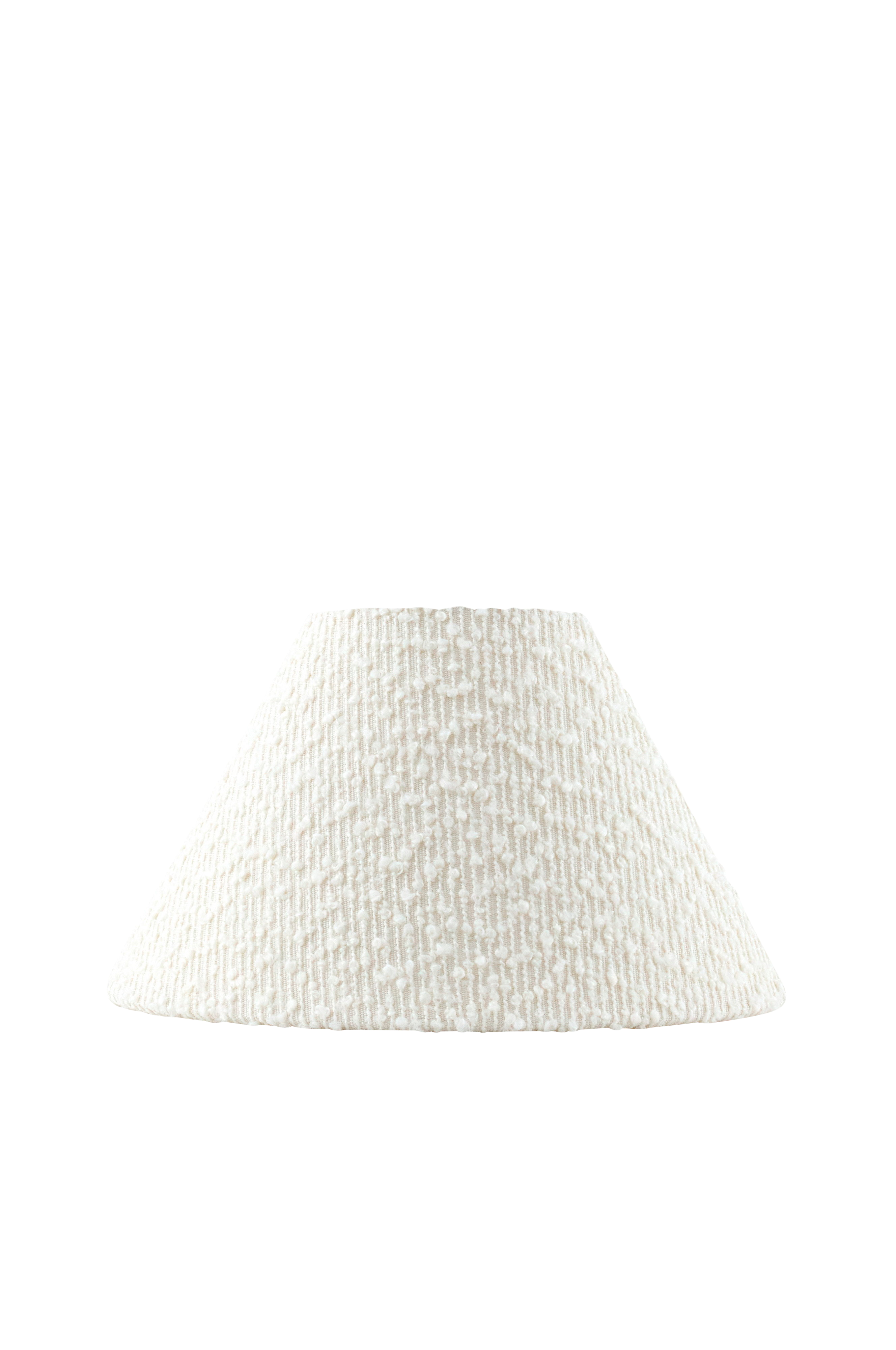 Iris kaunis tekstiilivarjostin on käsityönä valmistettu bouclé-kankaasta. Varjostimessa on yhteensopivaa tekstiiliä oleva päällinen, ja varjostimen sisällä on muovista valmistettu valkoinen häikäisysuoja. Varjostimessa on e14-kynsikiinnike, joka sopii valonlähteen ympärille.