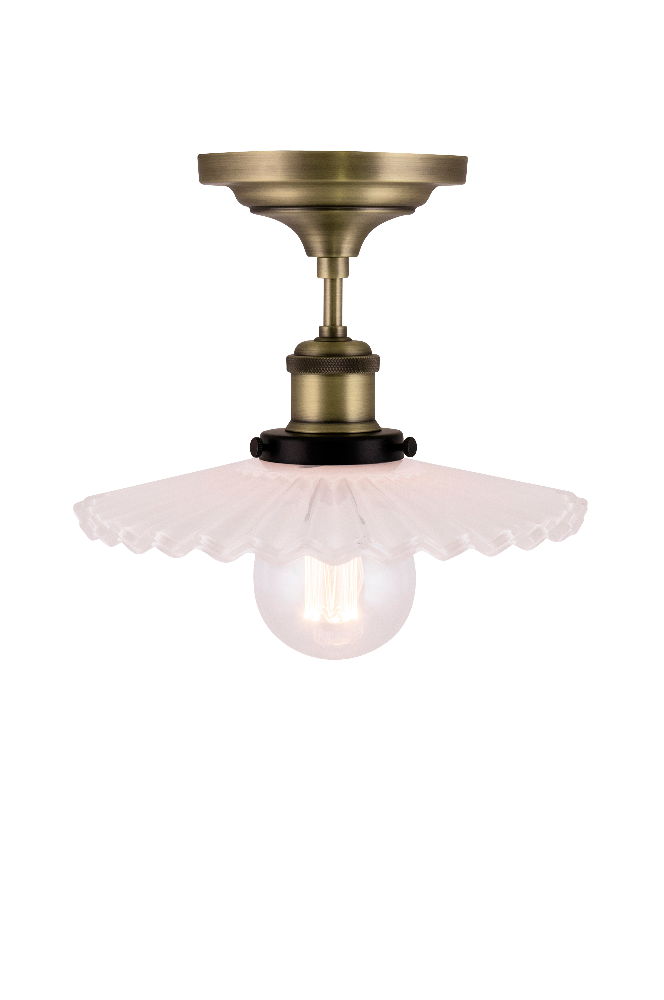 Vuosisadanvaihteesta inspiraationsa saanut pieni suutarityylinen plafondi, jossa poimutettu lasi sekä mattamustat ja antiikkimessinginväriset metallidetaljit. Suunnittelija GL Design Studio. Leveys 25 cm, syvyys 25 cm ja korkeus 19 cm. Lampunpidike 1 x E27. Enintään 60 W. Valonlähde ei sisälly toimitukseen.