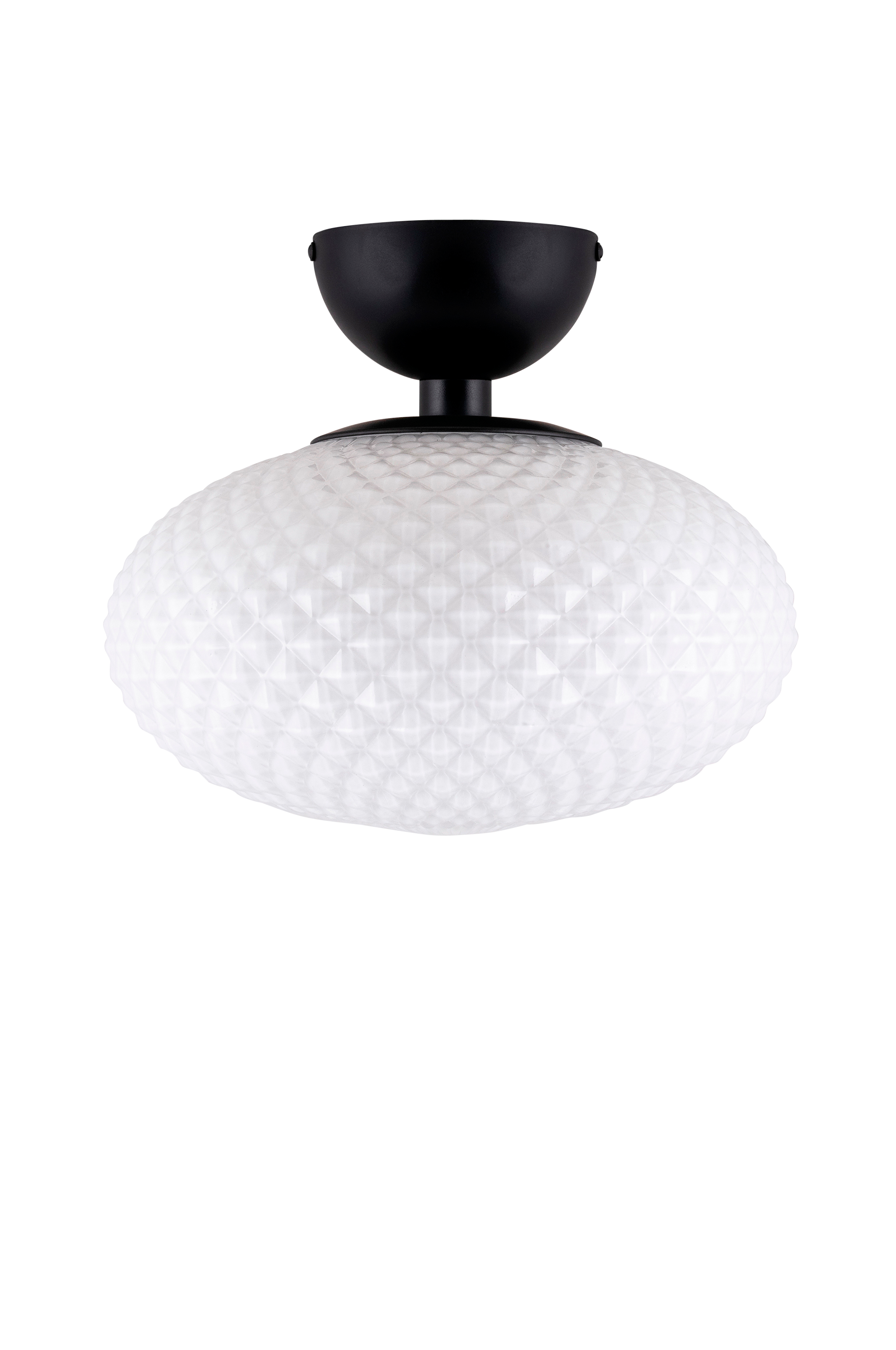 Tunnelmallinen Jackson-plafondi vie ajatukset 70-luvulle aikakaudelle tyypillisellä puristetulla lasikuvullaan. Ripustin ja pyöreä kattokuppi metallia. Leveys: 28, syvyys: 28, korkeus: 25 (cm). Lampunpidike: 1xE27. Enintään 60 W. Suositeltu valonlähde: L143 (ei mukana).