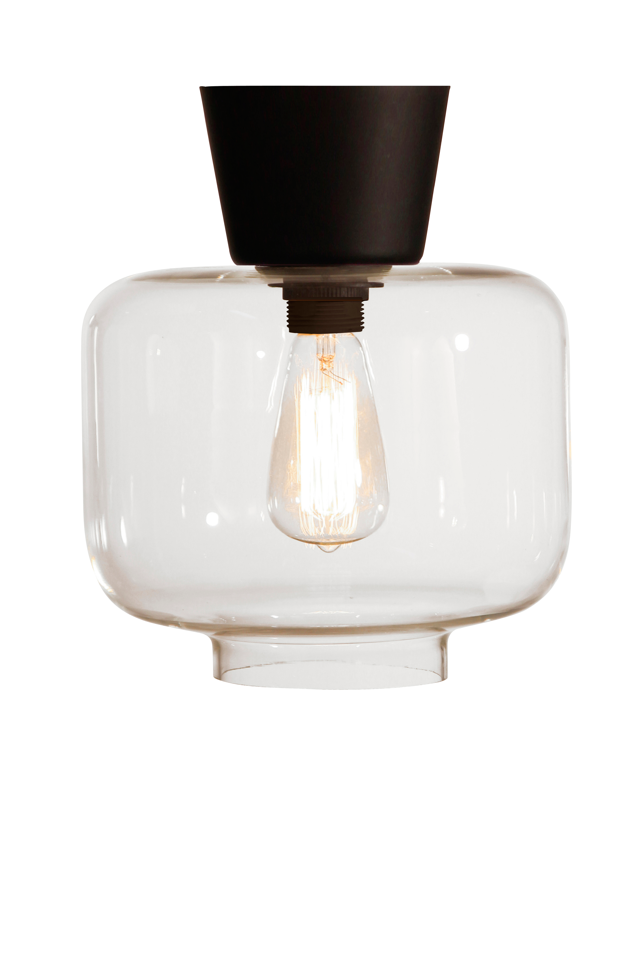 Plafondi läpikuultava lasia, mattamusta sokka ja ripustuskoukku. Korkeus 26 cm. Halkaisija 25 cm. Lampunpidike E27, leveä kanta. Enintään 60 W. Suositellaan Edison G44 -lamppua. Design: Tess Palm.