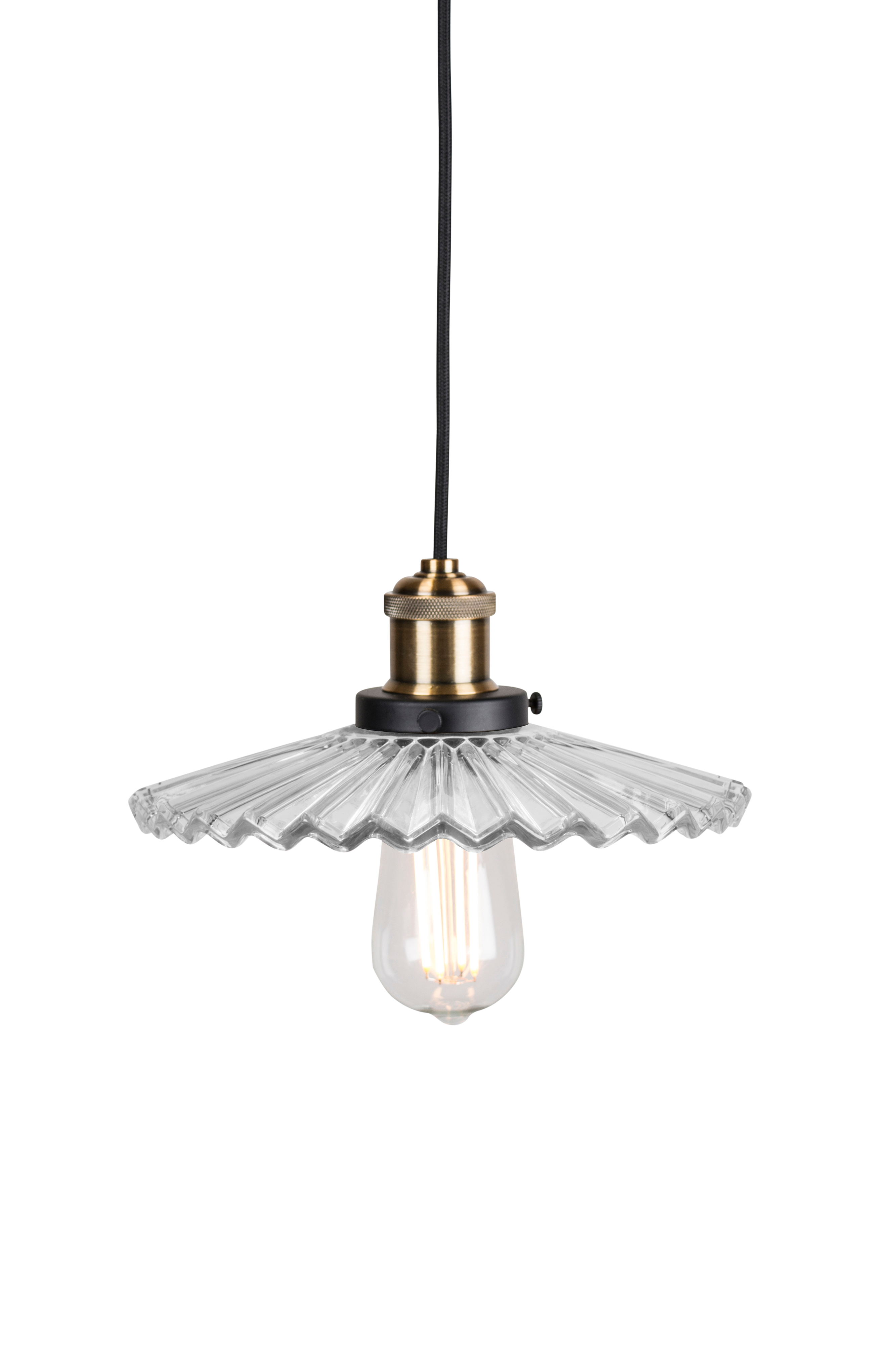 Vuosisadanvaihteen henkinen kattovalaisin räätälintyyliin. Lasia ja mattamustat/antiikkimessinkiset yksityiskohdat. 120 cm pitkä musta kangaspäällysteinen johto. Korkeus 13 cm Halkaisija 25 cm. Lampunpidike E27, enintään 60 W.