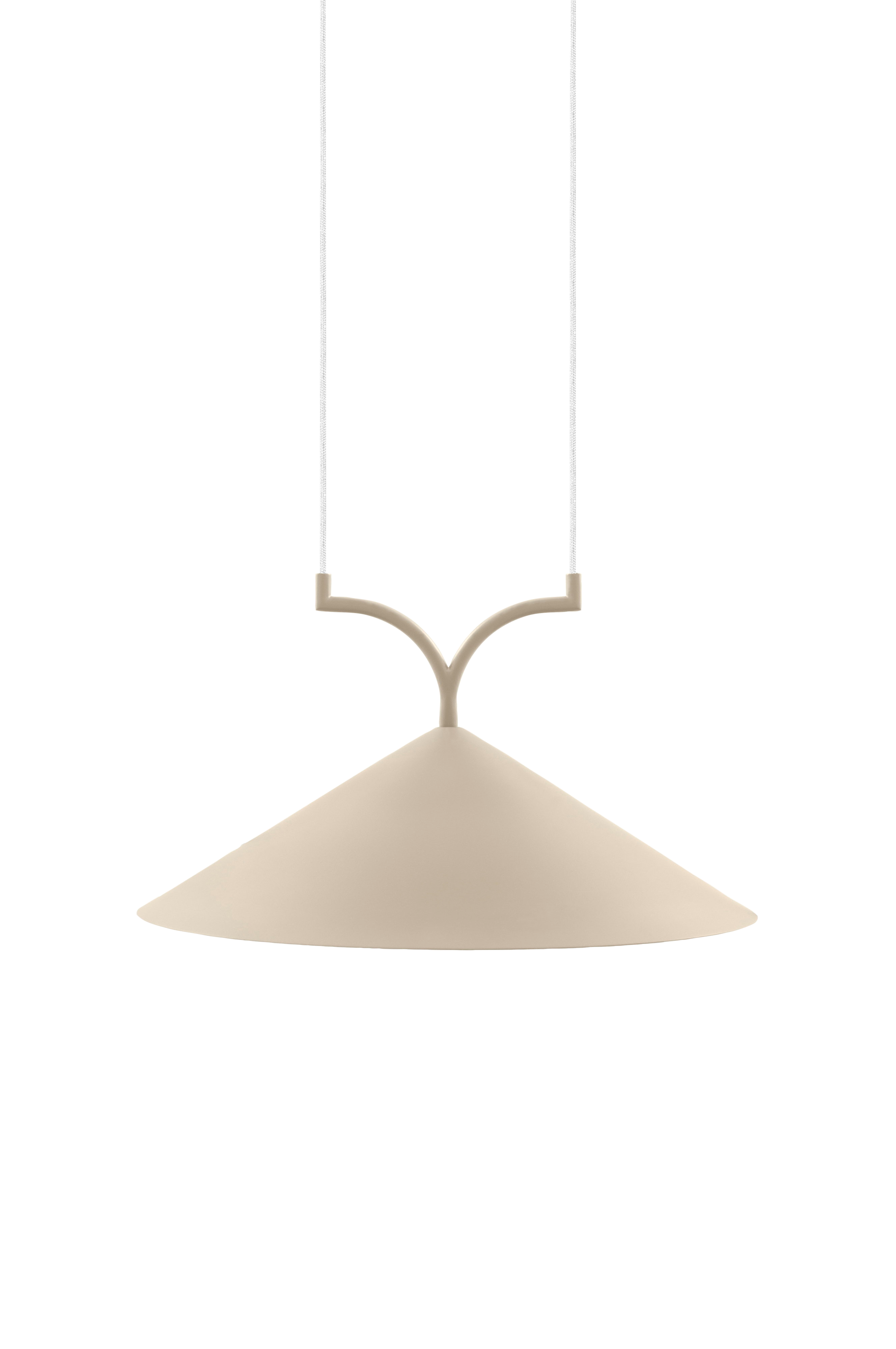 Curve on tulosta geometristen muotojen leikkisästä tutkimisesta, jossa pehmeät, pyöristetyt kaaret kohtaavat terävän, kolmiomaisen sävyn. Tämä valaisin sopii täydellisesti ripustettavaksi ruokapöydän yläpuolelle tai keittiösaarekkeen yläpuolelle. Curve on valmistettu mattapintaisesta lakatusta metallista, ja siinä on kaksi 120 cm pitkää valkoista tekstiilikaapelia, joissa on yhteensopiva metallinen kattokuppi. Valaisimen pistoke kattoliitäntää varten myydään erikseen.