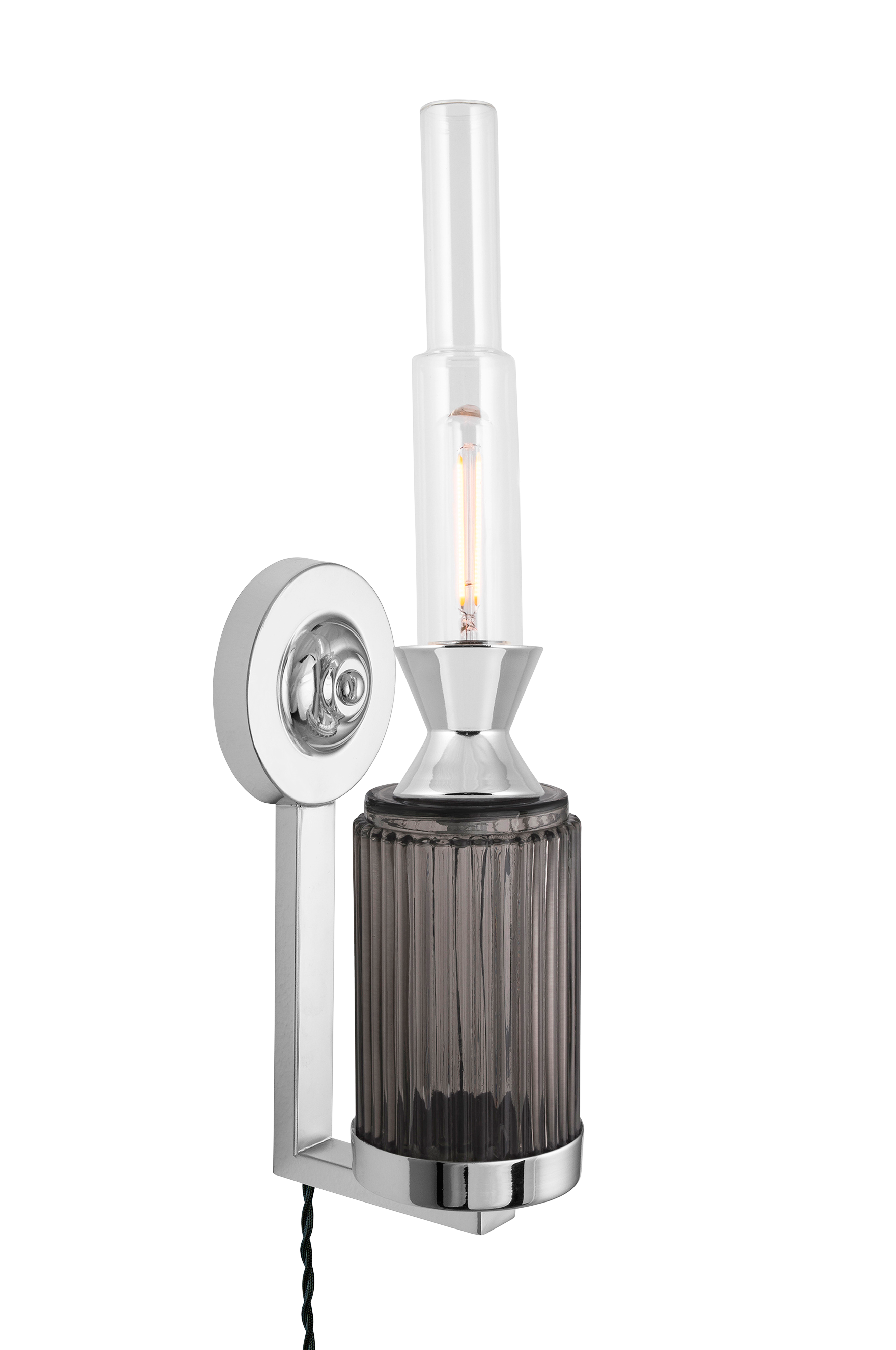 Pieni, kaunis seinävalaisin, joka on saanut inspiraationsa tunnelmallisista vanhanajan öljylampuista. Kauniisti uurrettu lasi ja detaljit metallia. Klassinen putkenmuotoinen lasi valonlähteen päällä. Ester-valaisimessa on 200 cm:n pituinen helmiäisenvärinen kierretty kangasjohto, jossa katkaisin. Suunnittelija Mikael Holvik. Leveys 14 cm, syvyys 14 cm ja korkeus 44 cm. Lampunpidike 1 x E14. Enintään 40 W. Valonlähde ei mukana.
