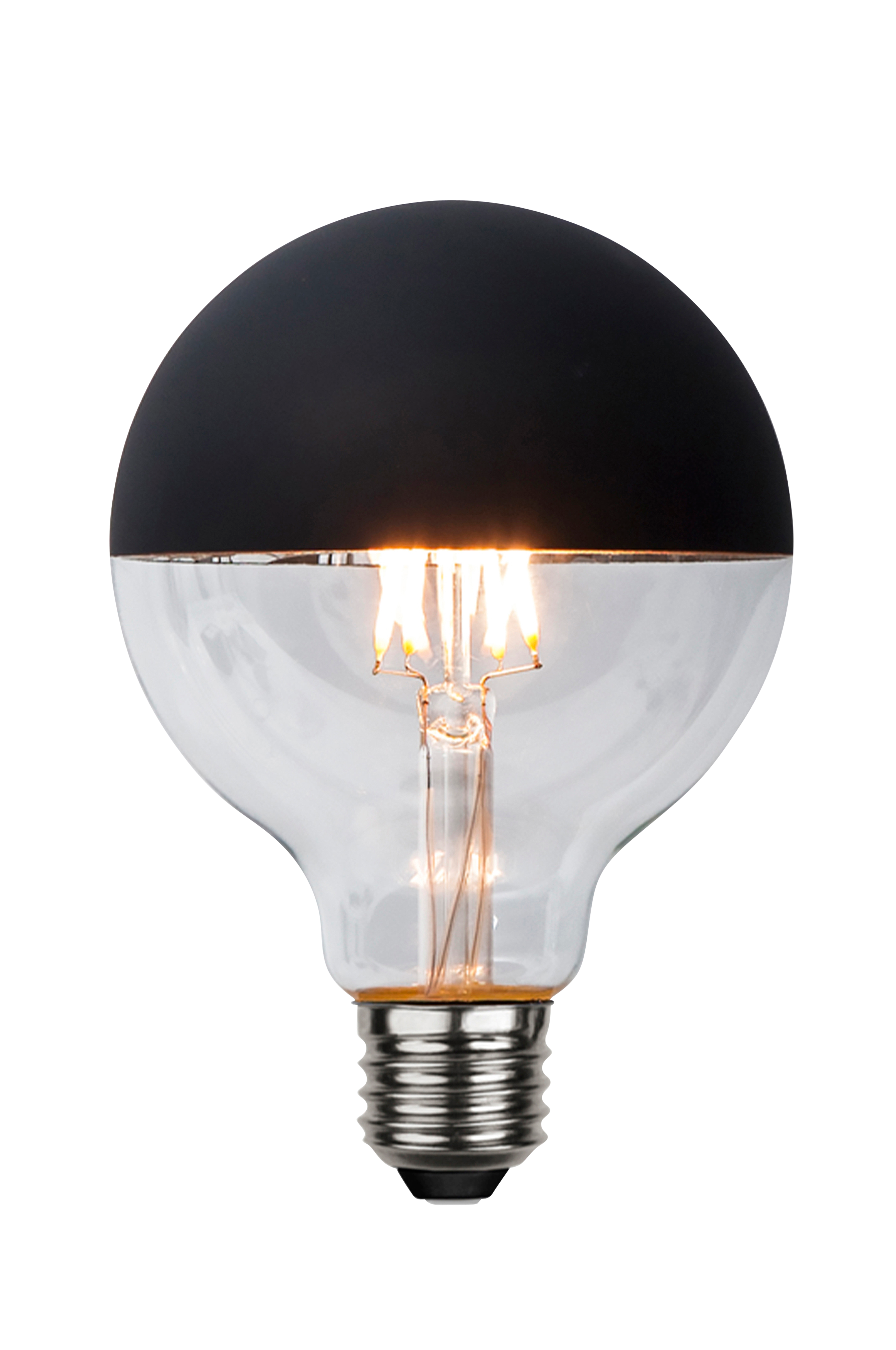 Valonlähde E27 LED, musta kärkipeili, himmennettävä. Valonlähteen kärkipeili heijastaa valon takaisin valaisimeen ja levittää siten valoa epäsuorasti. Valonlähde antaa lämpimän valkoista valoa. CE-merkitty. Energiankulutus (Watti): 2,8 W. Värilämpötila (Kelvin): 2 600 K. Valovirta (Lumen): 260 lm. Pallolamppu, jonka halkaisija 9,5 cm ja korkeus 13,8 cm. Käyttöikä: 15 000 h. Materiaali: Lasia.