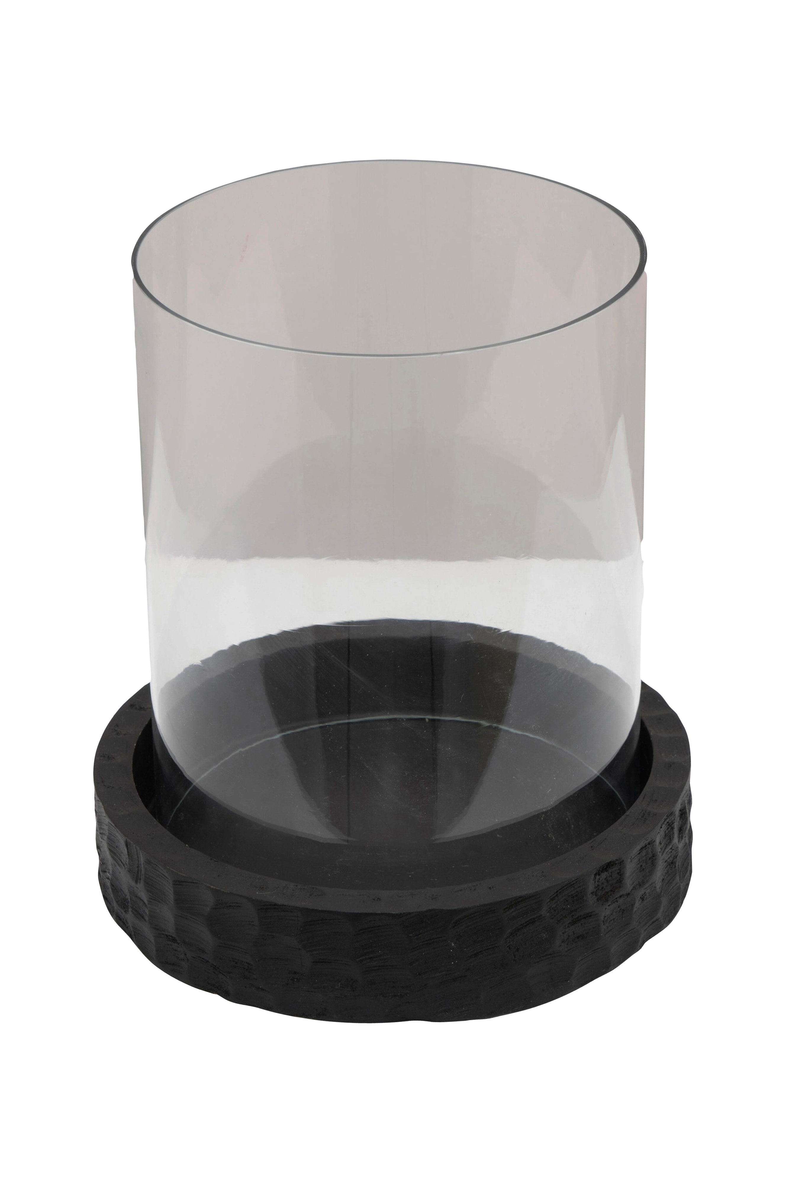 Pyöreällä mustalla puisella jalustalla oleva lasinen lyhty, joka sopii kynttilöille.
