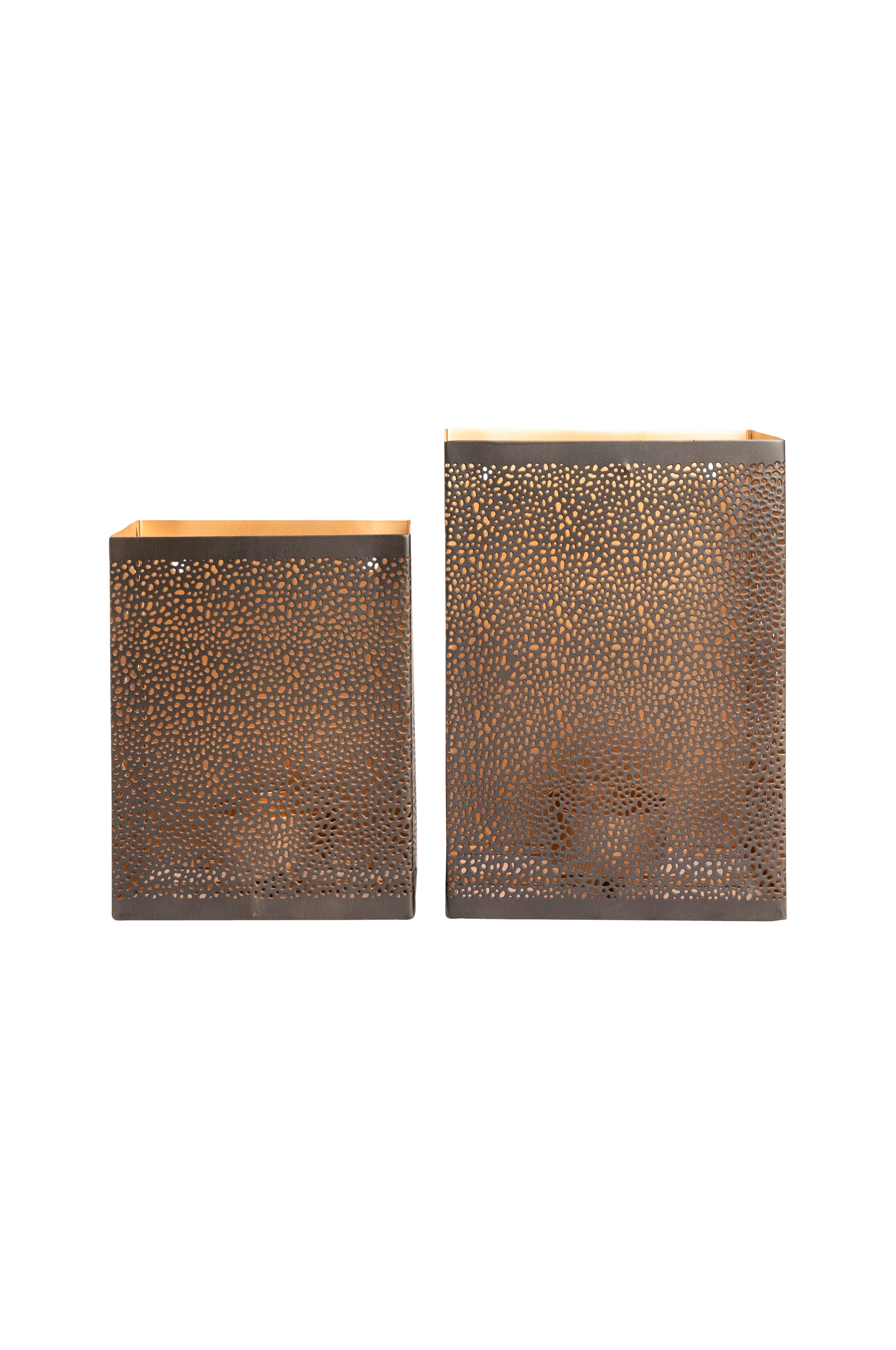Kahden neliön muotoisen seinälyhdyn sarja, hiilenharmaata metallia, jossa on kultainen sisäpinta ja kaunis rei'itetty kuvio. Lyhtyjen mukana toimitetaan pidikkeet teekynttilöille tai pilarikynttilöille. 2 kpl:n setti, eri kokoisia. Pieni: K 25 x L 17 x S 13 cm. Suuri: korkeus 20 x leveys 15 x syvyys 11 cm. Suunnittelu: Halvor Bakke. Jotkin puulajit voivat reagoida kosketuksissa metallin kanssa ja saada tummia jälkiä. Tarkista, mitä pintasi sietää, ennen kuin asetat tuotteen suoraan kosketukseen.