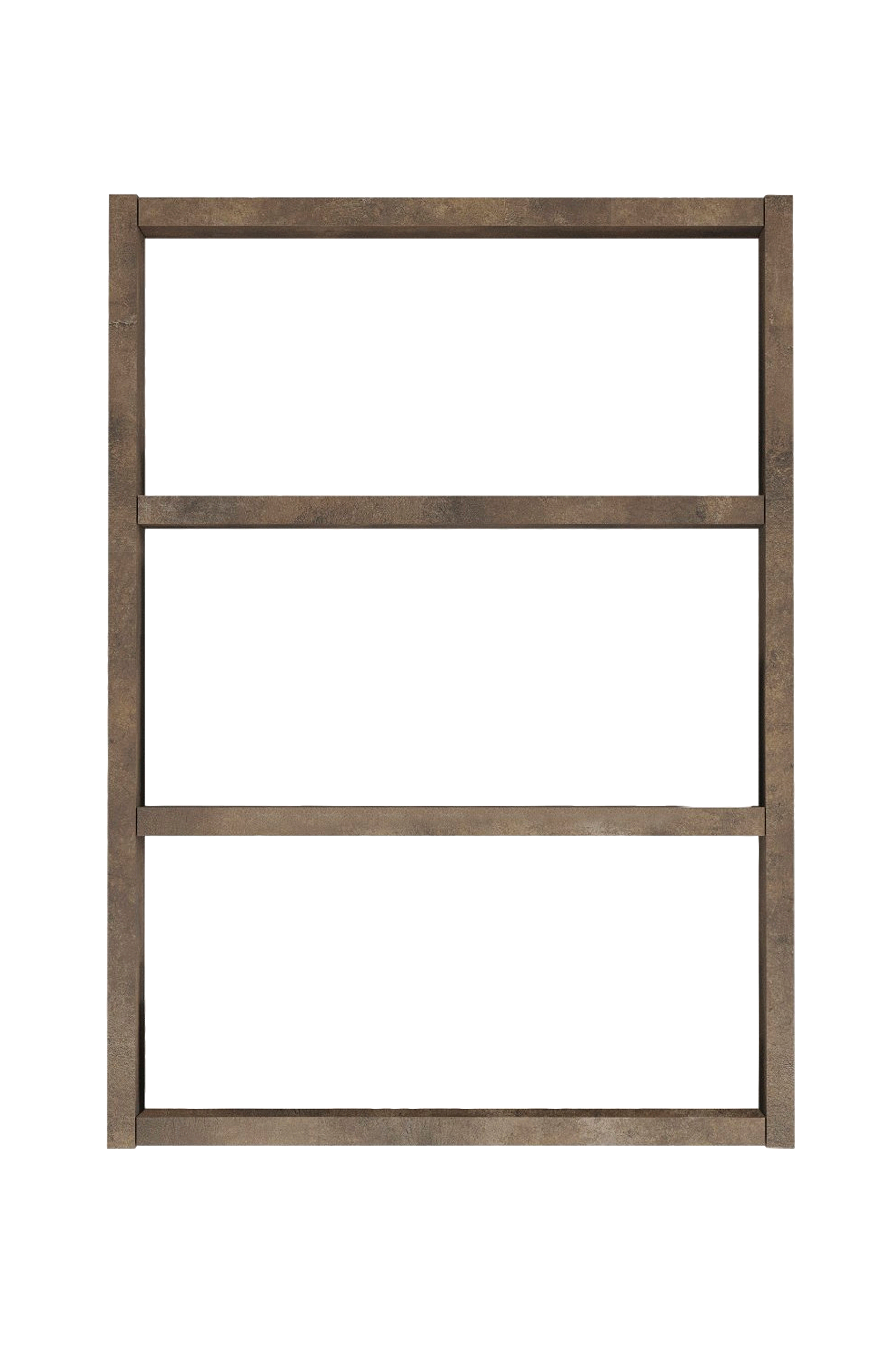 Hyllyn sivuilla on jokaisen hyllyn sivuilla näkyviä metalliruuveja, joita ei näy kuvissa. Itse hyllyn ruuvinreiät on esiporattu epätasaisesti.