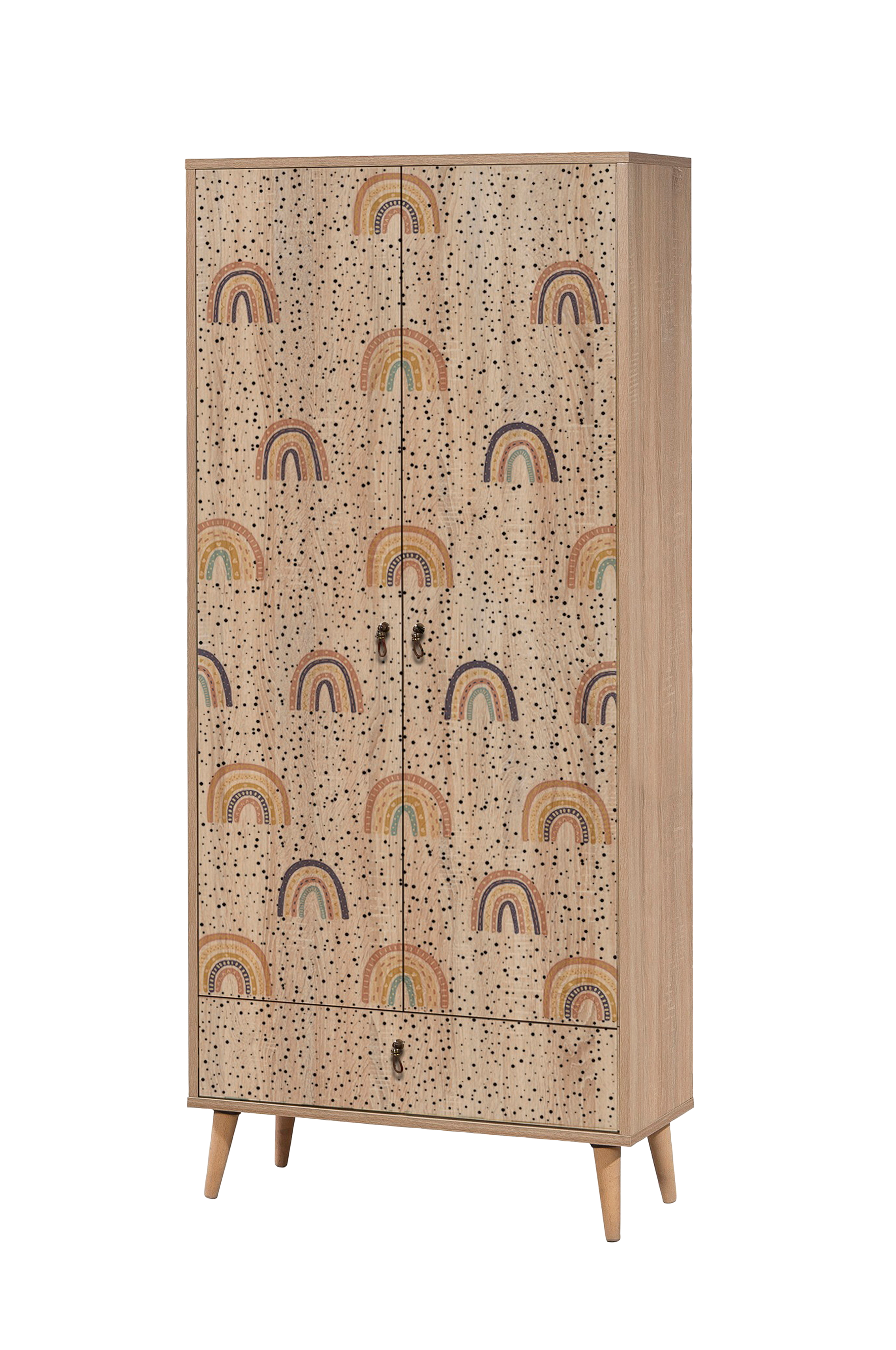 Tyylikäs muotoilu, mutta erittäin huonolaatuinen puutyö ja saranat. Useita vaurioita ovissa, ja laatikosta puuttui levy.