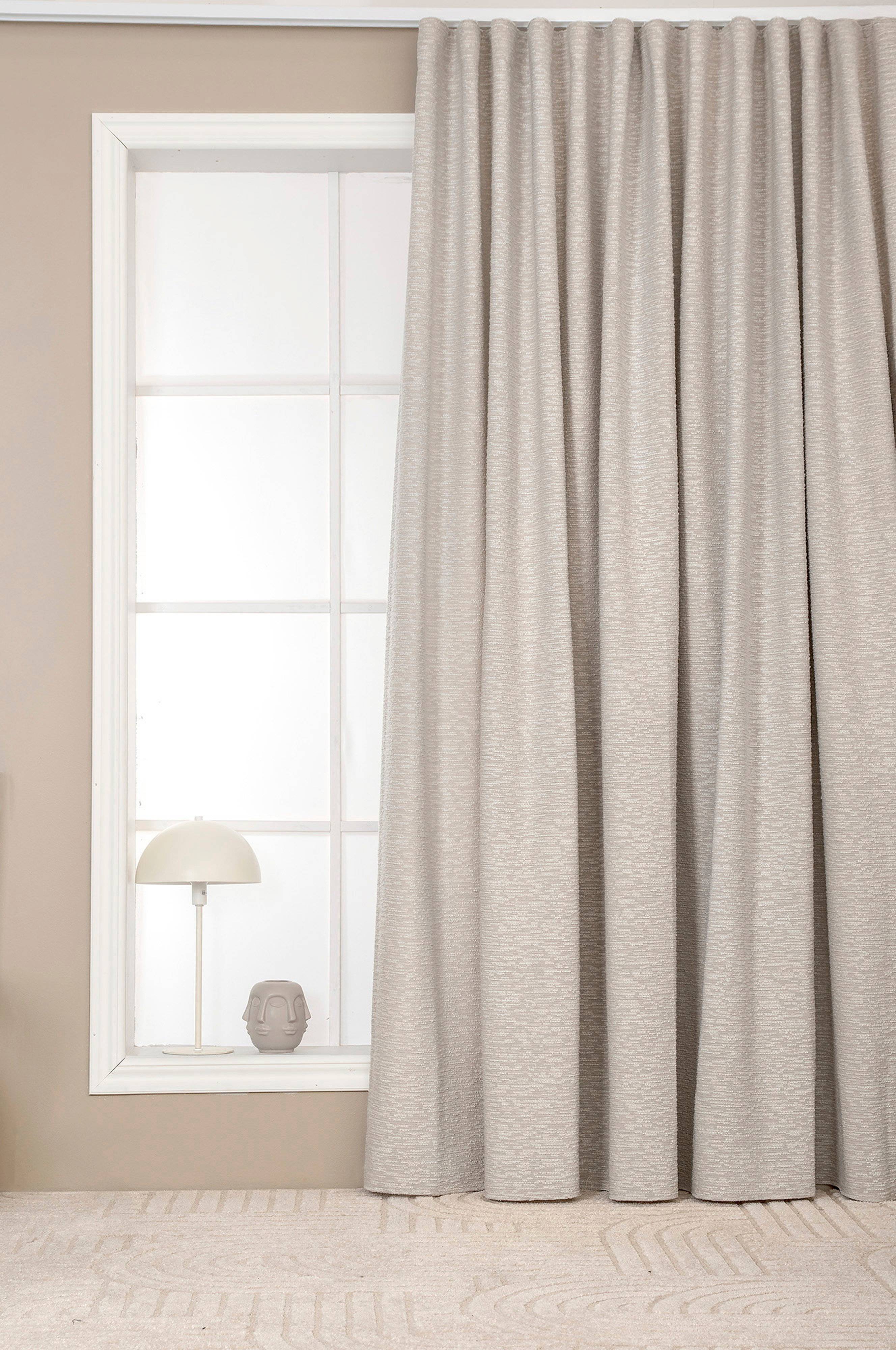 Erittäin leveä verho, jossa on bouclé-kangas. Monikäyttöinen verhonauha neljää eri ripustusvaihtoehtoa varten: suoraan tankoon, syvän laskoksen koukkujen, verhokoukkujen tai modernin aaltomaisen tyylin avulla. Verhokoukut eivät sisälly toimitukseen. Yksi verhon pituus per pakkaus.