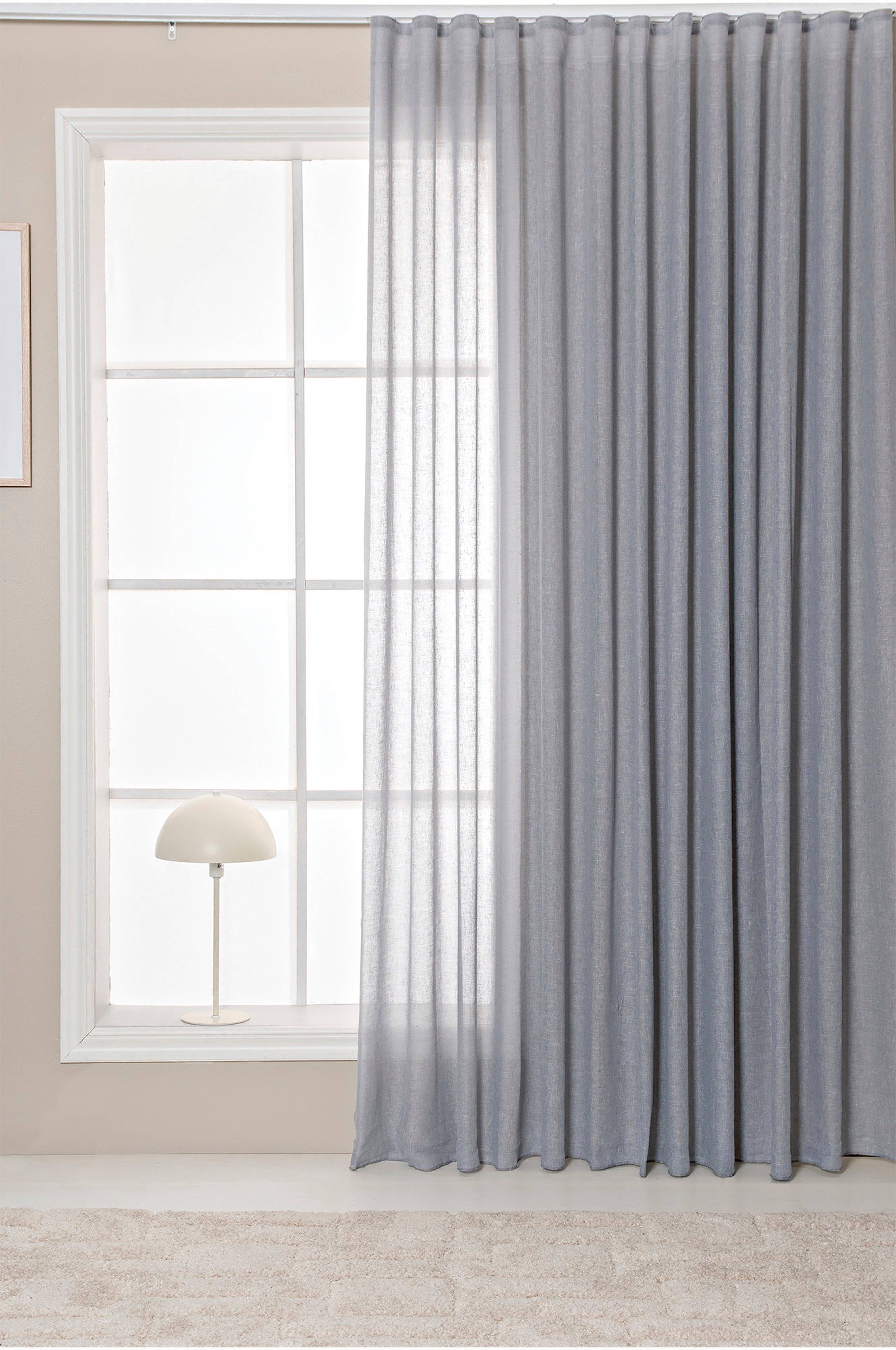 Erittäin leveä, pellavarakenteinen Voile-verho. Monikäyttöinen verhonauha neljää eri ripustusvaihtoehtoa varten: suoraan tankoon, syvän laskoksen koukuilla, verhokoukuilla tai modernilla aaltotyylillä. Yksi verhon pituus per pakkaus.