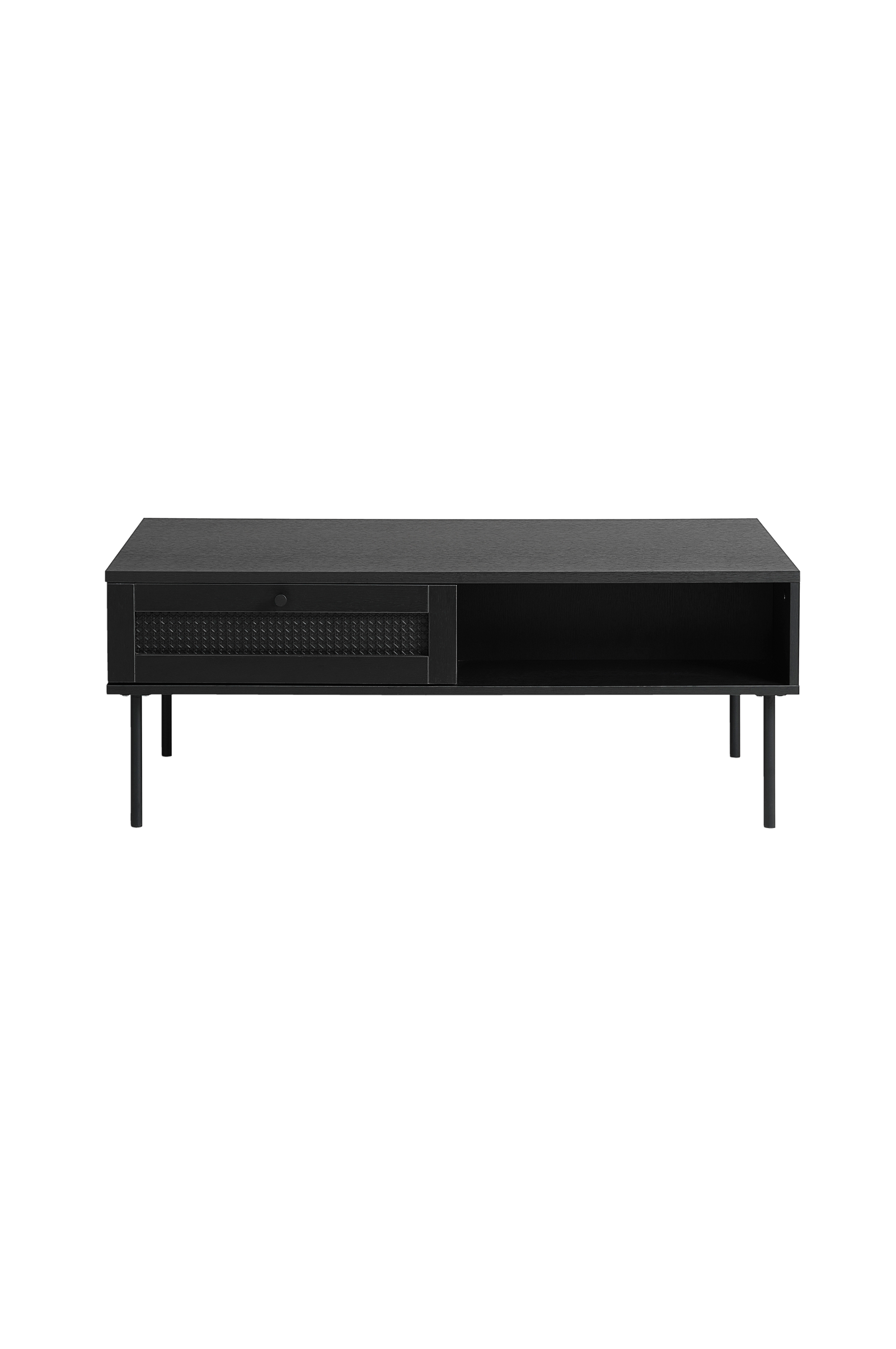 Tässä sohvapöydässä on moderni skandinaavinen muotoilu, tyylikäs viimeistely ja tukevat metallijalat. Siinä on kuvioitu laatikko piilotettua säilytystilaa varten ja avoin hylly, jossa voit esitellä sisustusta tai tarjota helpon pääsyn välttämättömiin tarvikkeisiin. Sen minimalistinen tyyli tekee siitä monipuolisen kappaleen mihin tahansa olohuoneeseen.