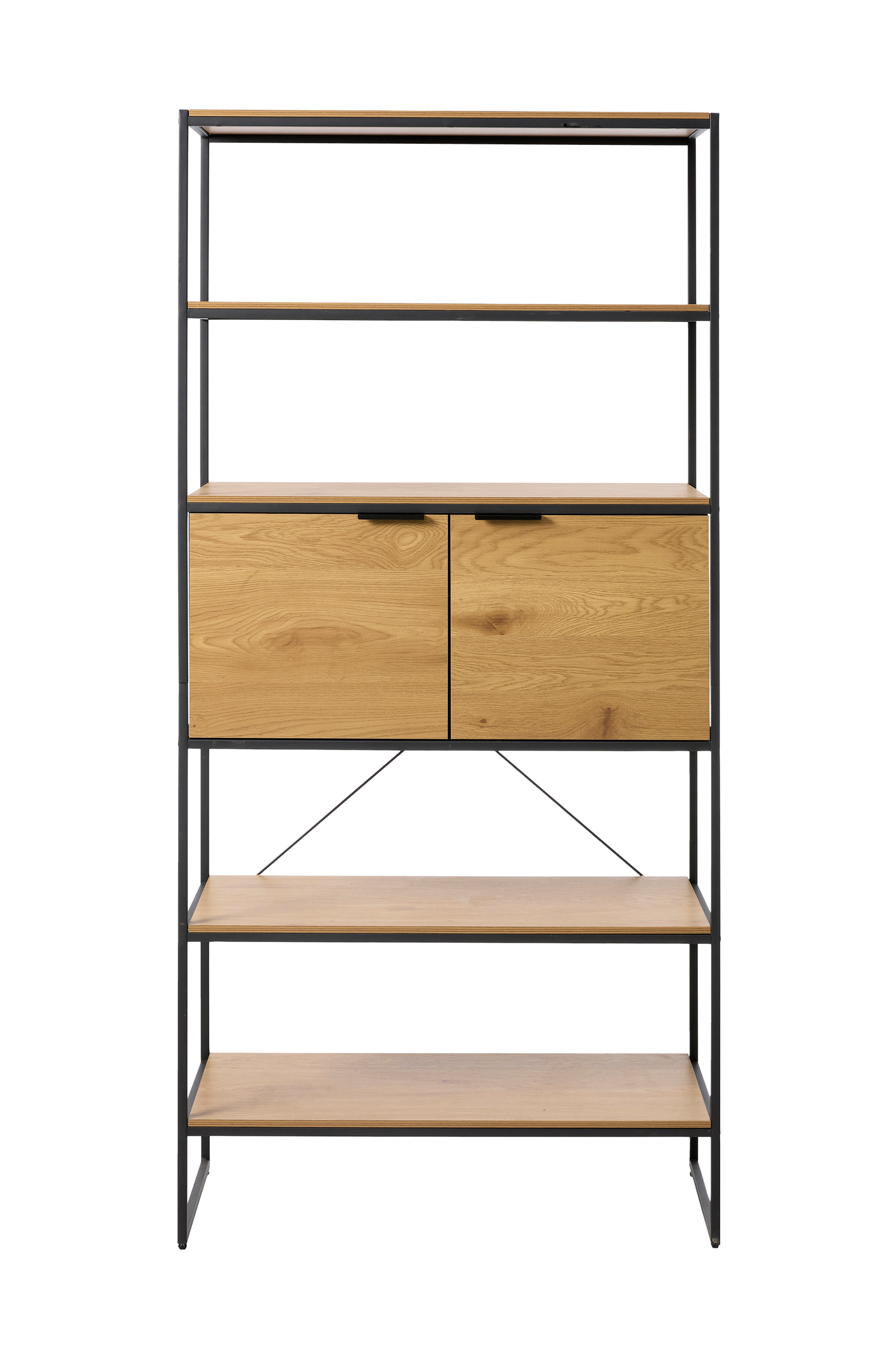 Tässä modernissa hyllystössä yhdistyvät tukevat metallirungot ja luonnollisesta puusta valmistetut hyllyt, jotka tarjoavat sekä tyyliä että toiminnallisuutta. Avohyllyt tarjoavat runsaasti tilaa näyttelyyn tai säilytykseen, kun taas kaksi alempaa kaappia tarjoavat piilotettua säilytystilaa, jotta tila pysyy järjestyksessä. Sen tyylikäs, teollinen muotoilu ja selkeät linjat tekevät siitä täydellisen lisän mihin tahansa nykyaikaiseen olohuoneeseen, toimistoon tai eteiseen.