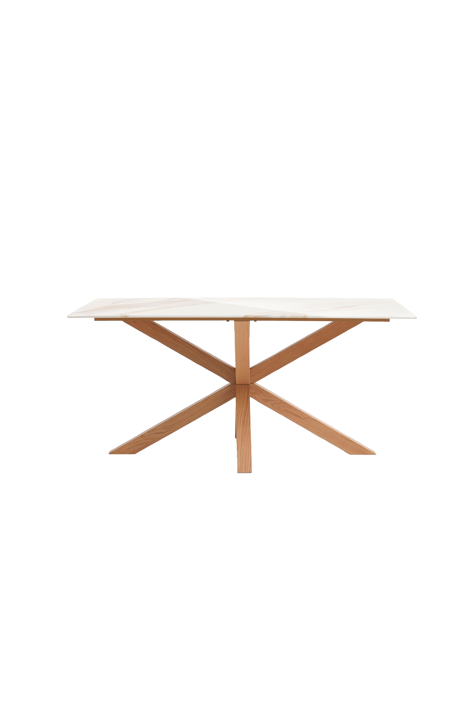 Tässä tyylikkäässä ruokapöydässä on tyylikäs keraamisen näköinen pöytälevy ja massiivipuinen ristijalusta, joka luo lämpimän ja modernin ilmeen. Sen selkeät linjat ja vankka rakenne tekevät siitä tyylikkään keskipisteen mihin tahansa ruokailutilaan, ja se tarjoaa sekä kestävyyttä että nykyaikaista muotoilua.