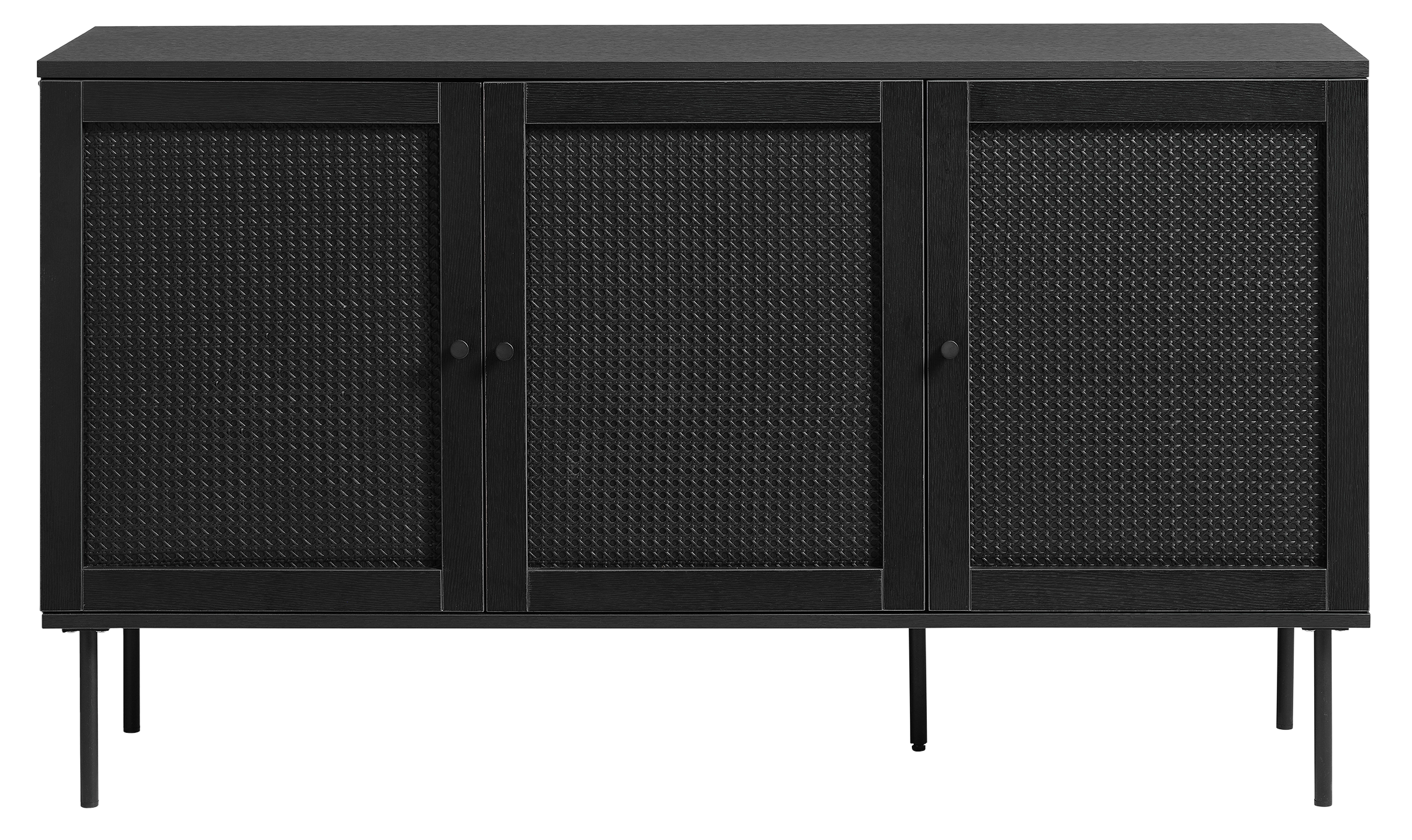 mustiin metallikahvoihin ja -jalkoihin sekä viehättävään mustaan tammistrukturoituun viimeistelyyn.