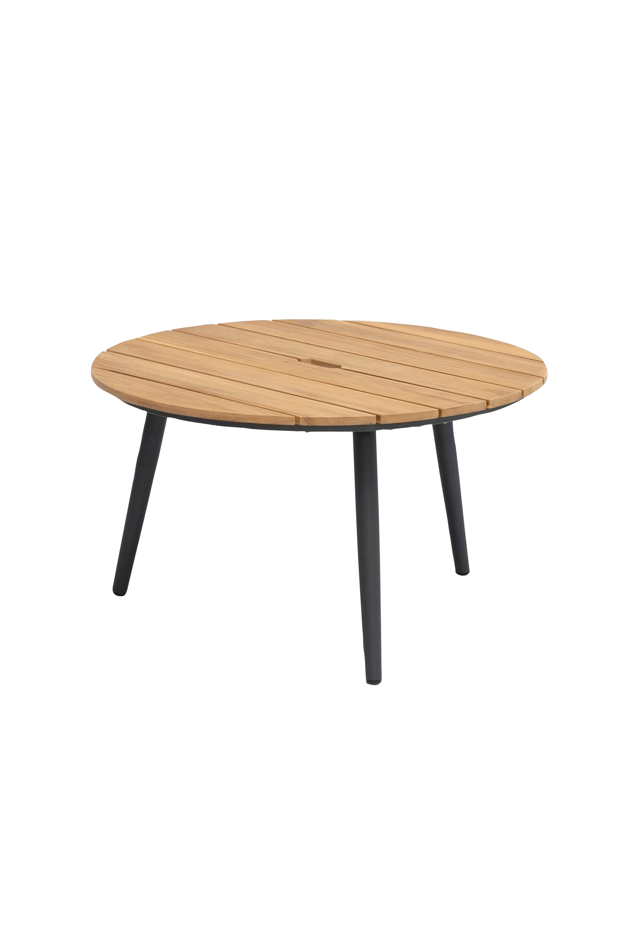 siisti pöytä, joka on valmistettu fsc®-merkitystä laadukkaasta teakista ja jonka jalat ovat antrasiitinharmaasta jauhemaalatusta alumiinista.