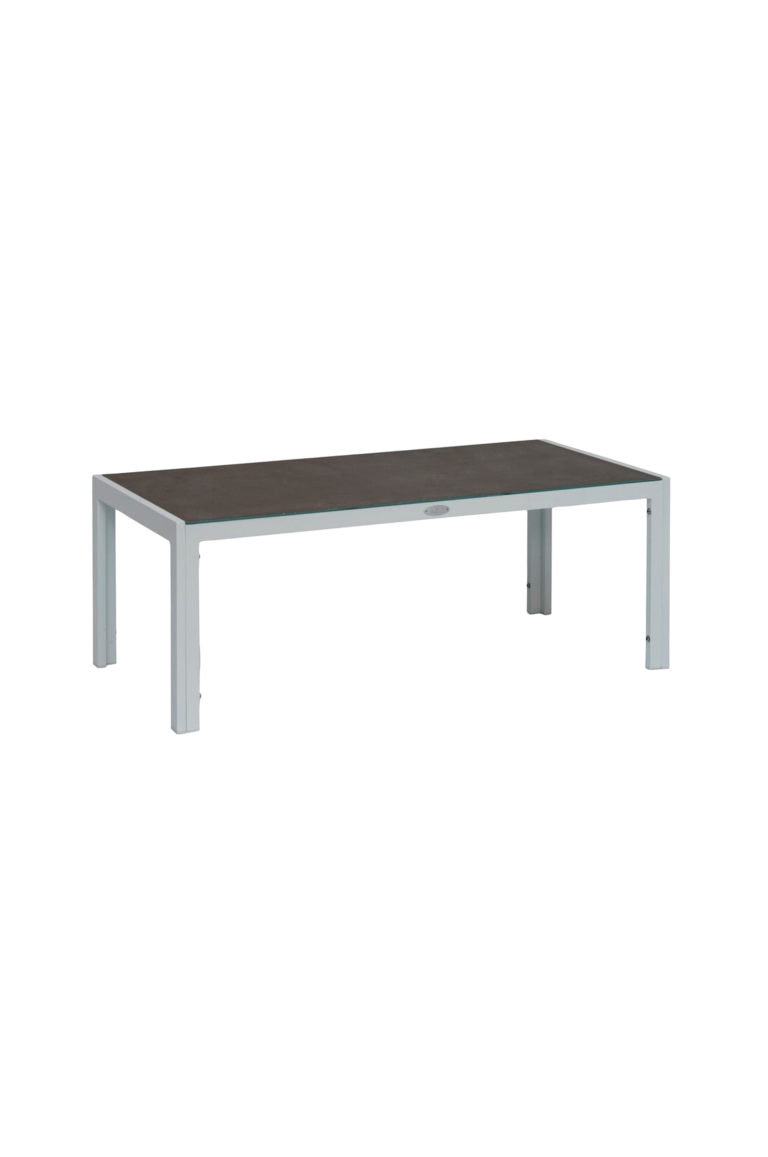 Tyylikäs ja huoltovapaa oleskelupöytä, joka on valmistettu alumiinista ja jonka pöytälevy on 5 mm paksu, lämpimän harmaa, keraaminen lasipinta.