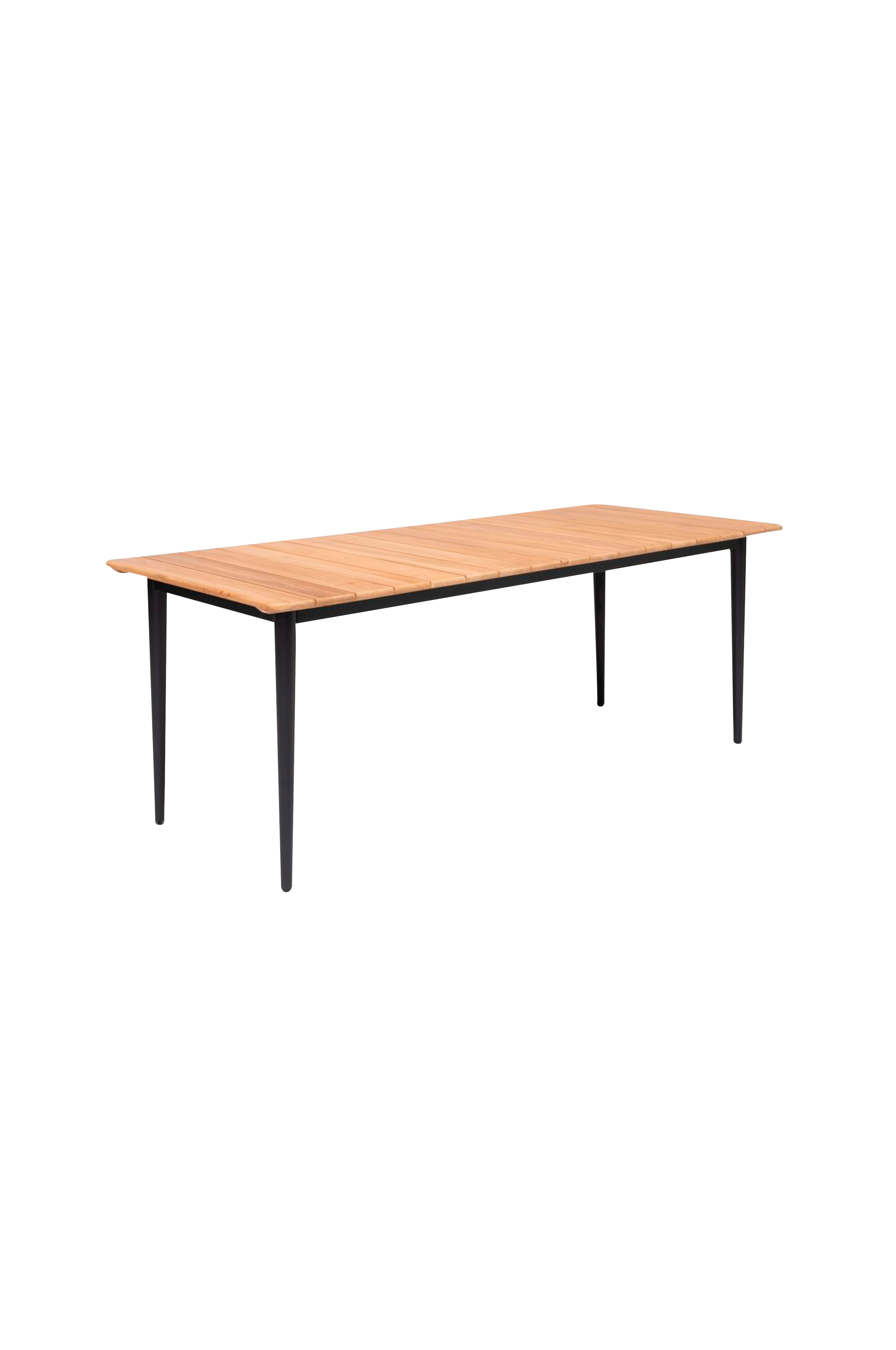 Moderni ja tyylikäs pöytä alumiinirungosta, jonka pöytälevy on käsittelemätöntä tiikkiä.