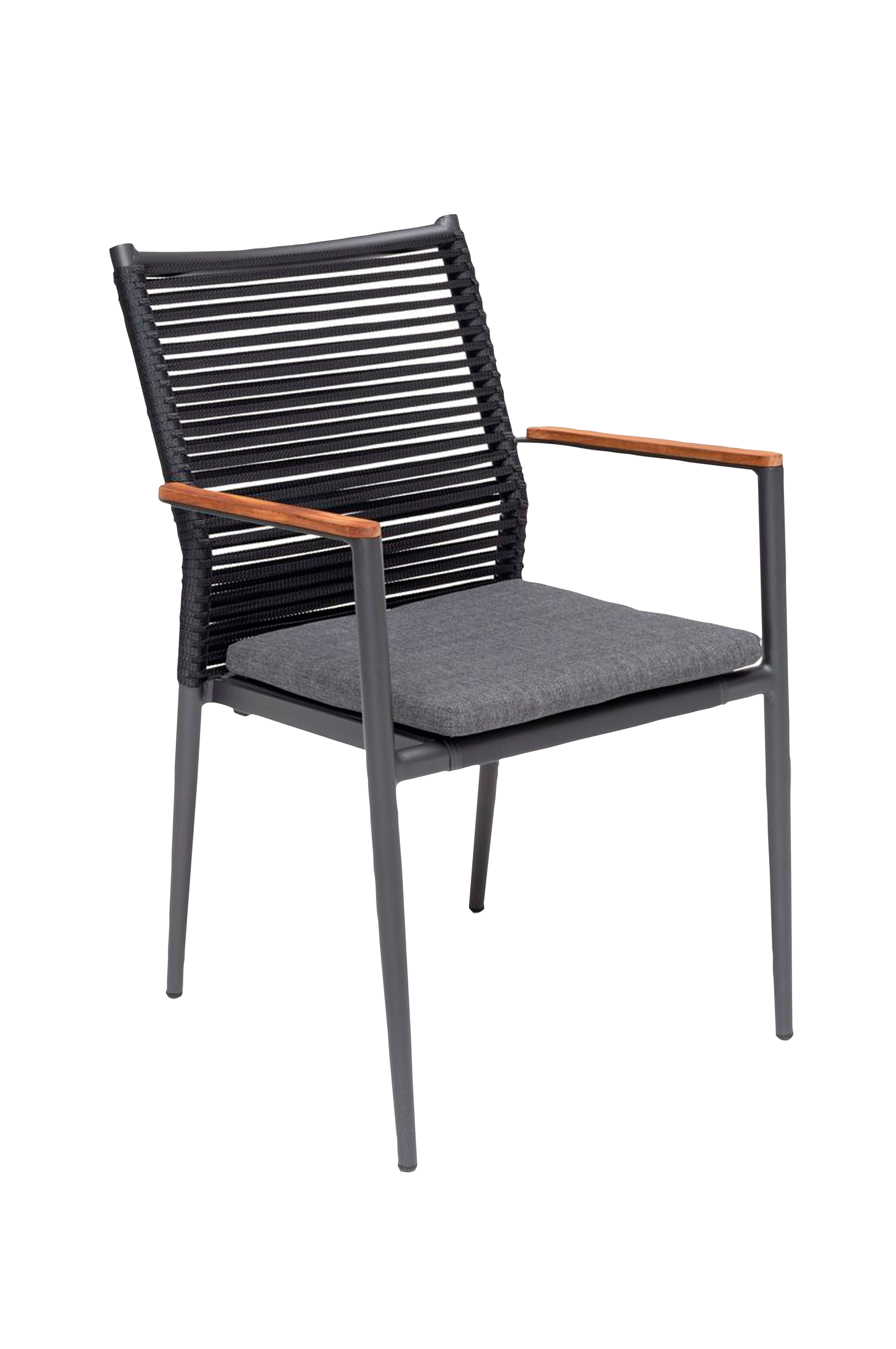 Moderni ja mukava tuoli. Valmistettu alumiinirungosta, mustasta polyetsr-köydestä ja käsinojat teakista. Tuolit ovat pinottavia ja niitä myydään 2 kpl.