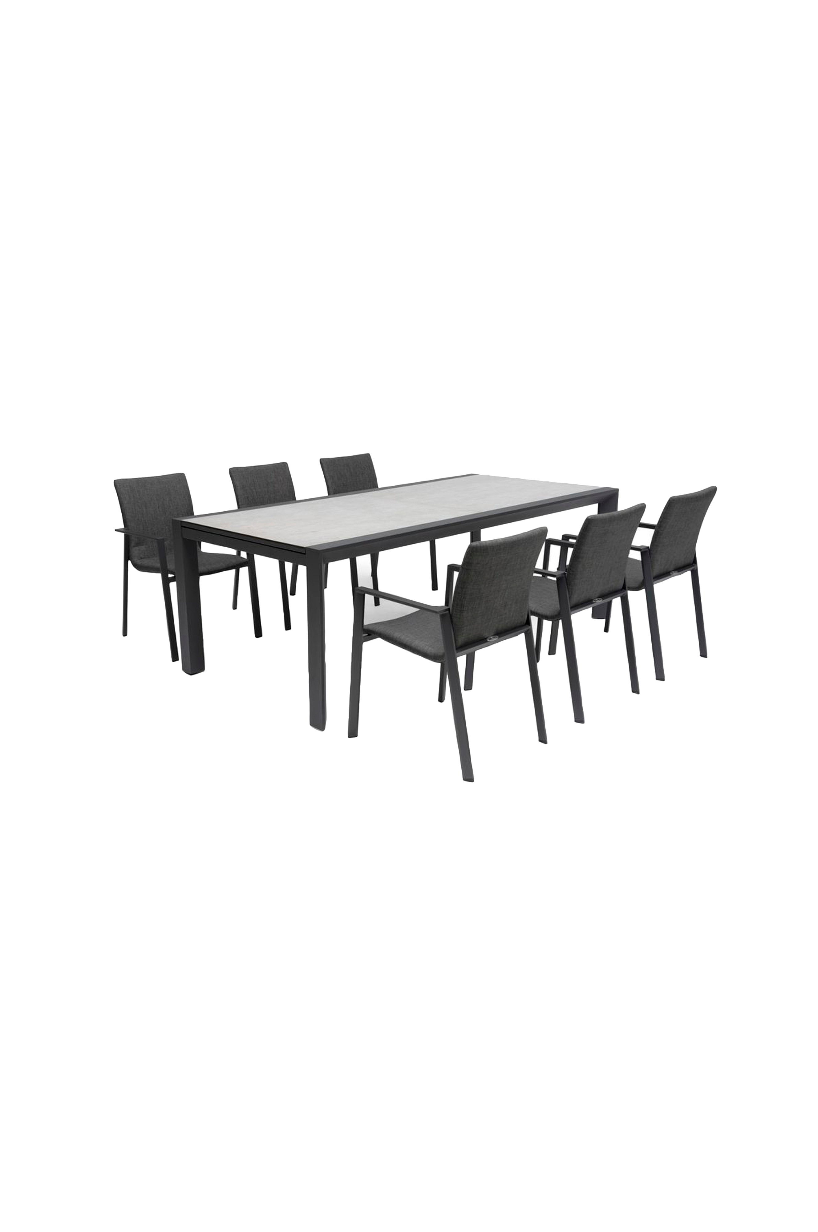 joustava kalustesarja tuoleineen ja pöytineen. Pöydässä on käytännöllinen jatkopöytälevy, joka kasvattaa pöytäpinta-alan 220 cm:stä yhteensä 340 cm:iin. Valmistettu alumiinista hiilenvärisenä. Pöytälevy laminoitua lasia. Pinottavat tuolit harmaalla verhoiltua kangasta, joka ei vaadi lisätyynyä. Tekstiili on helppohoitoista ja nopeasti kuivuvaa materiaalia.