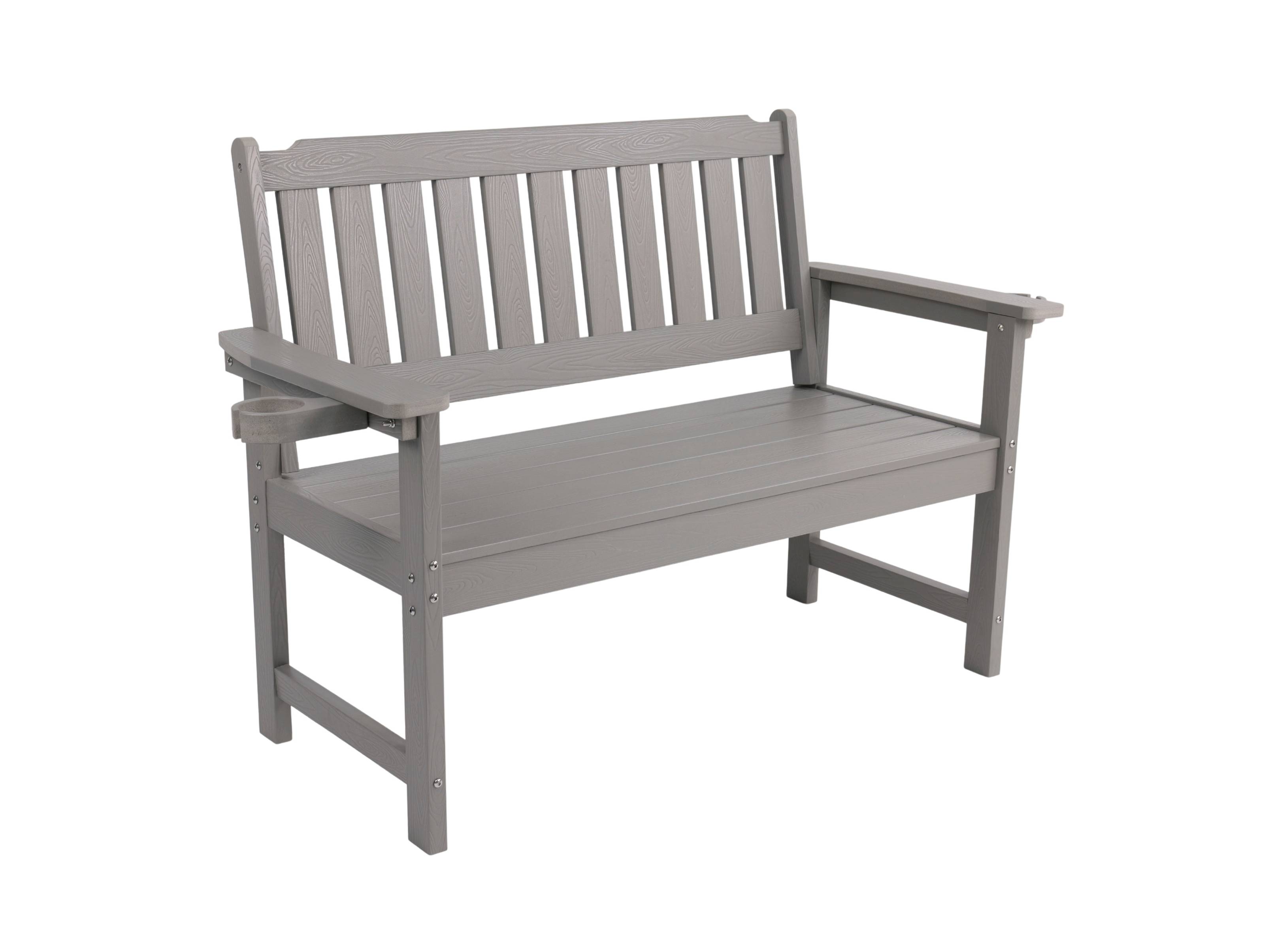 Tilava ja toiminnallinen ulkopenkki, jossa on klassinen muotoilu ja integroidut mukitelineet lisäävät mukavuutta.