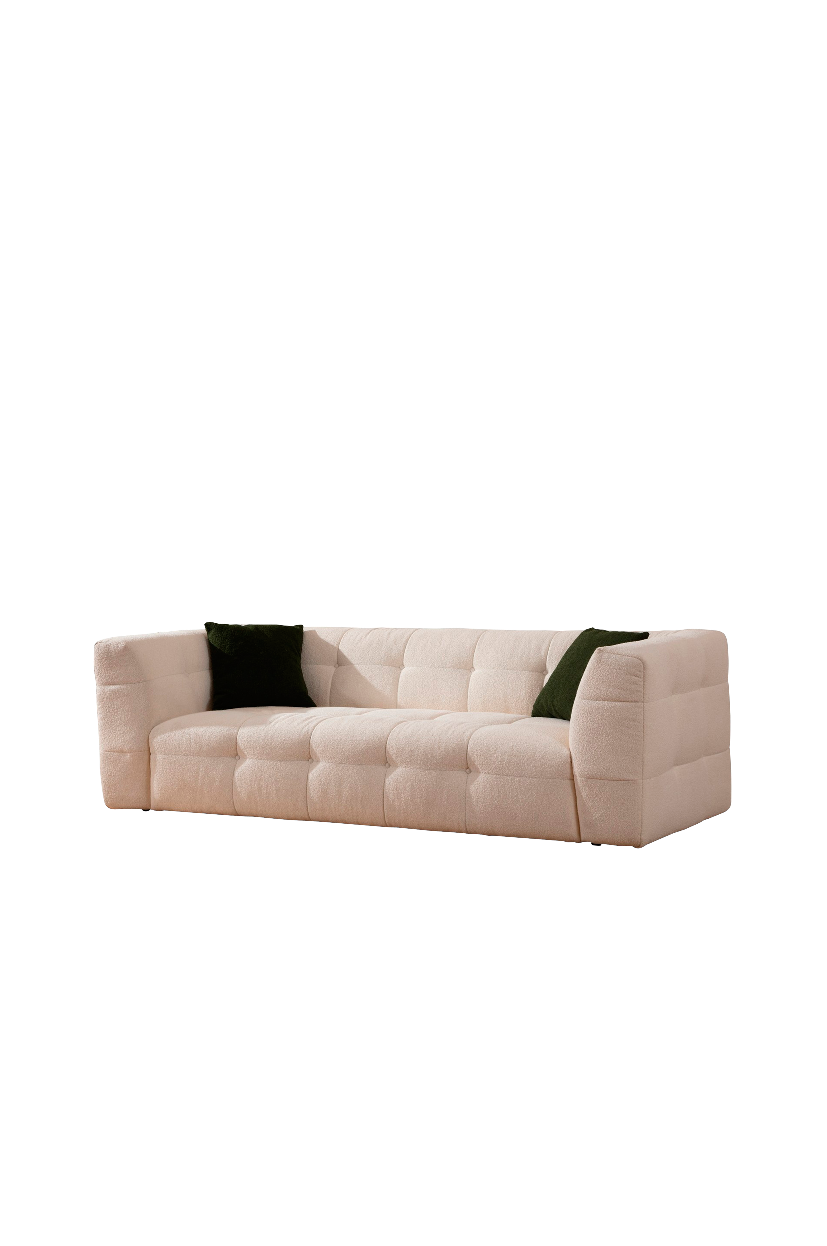 Kaunis kangas ja ihana tummanvihreä väri, jossa on kauniit pienet valkoiset sohvatyynyt mukana.