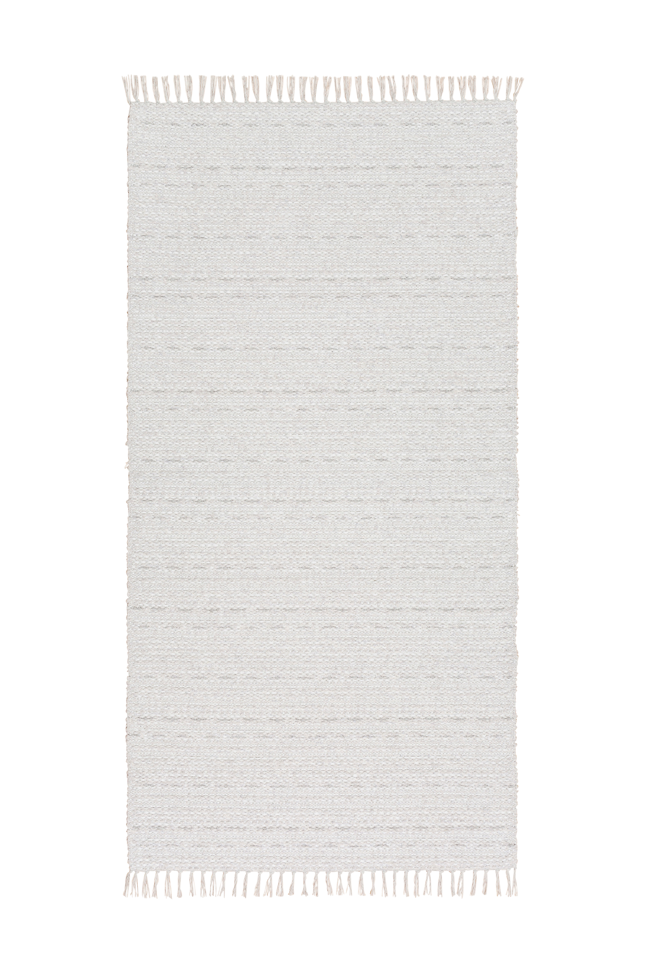 Näyttää kangasmatolta, mutta pysyy hyvin paikallaan kuin muovimatto. Väri on kylmä beige/harmaa ja kirjavampi kuin kuvassa.