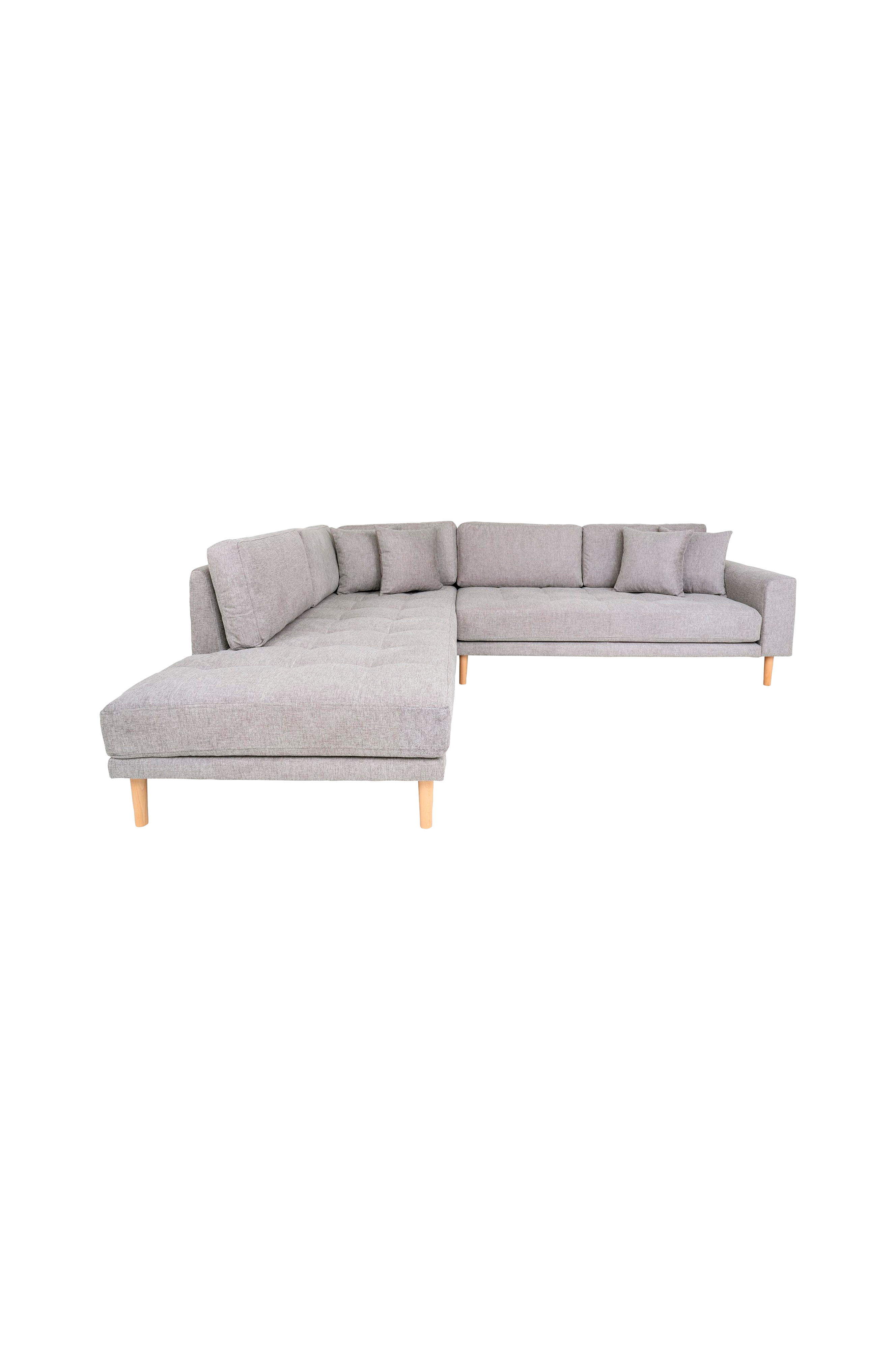 Kulmasohva, jossa open-end vasemmalla sivulla, neljä tyynyä ja luonnonväriset puujalat.