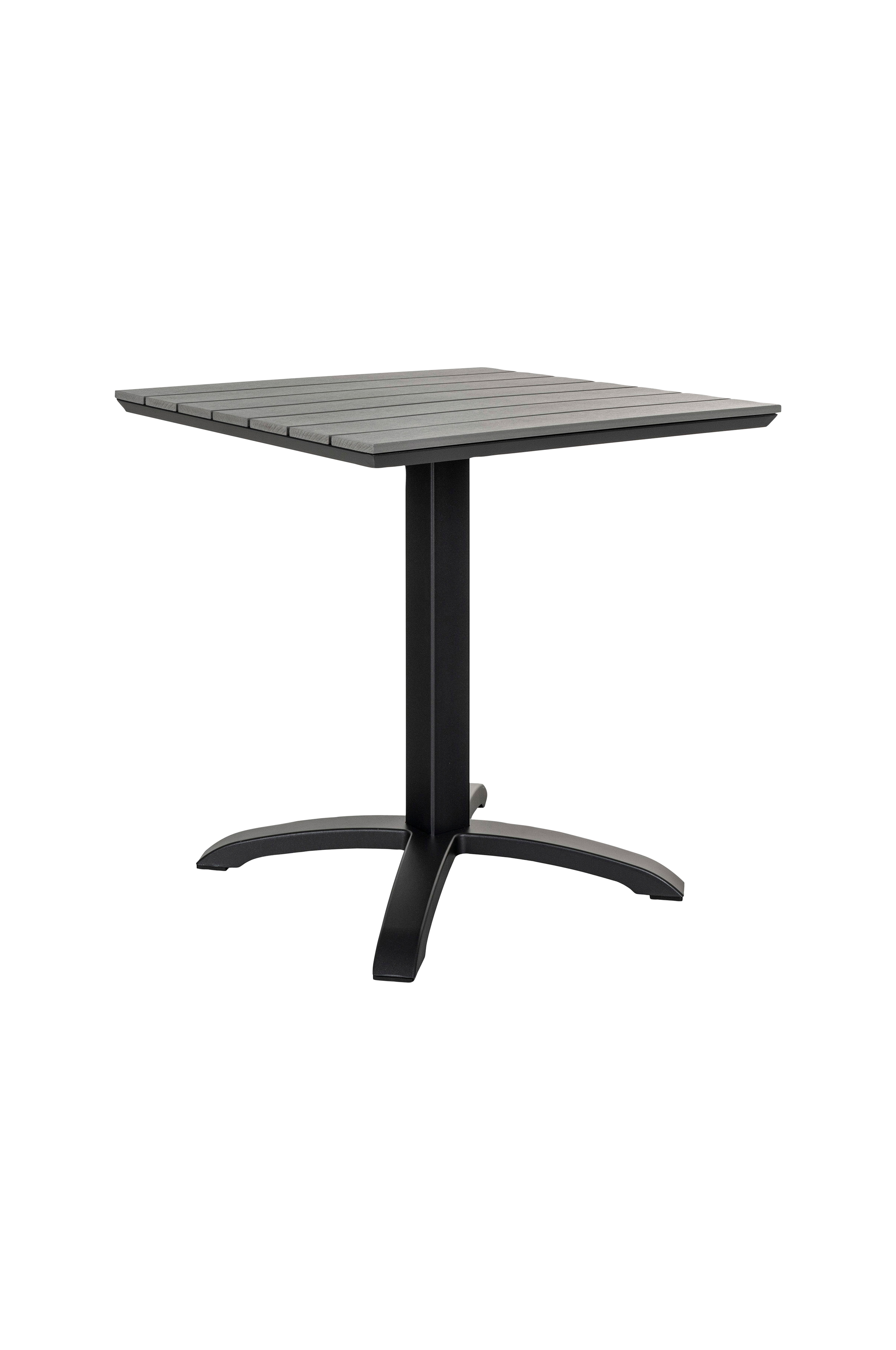 Puutarhapöytä, jossa harmaa pöytälevy nonwood-materiaalia ja musta jalka, 70x70x72 cm.