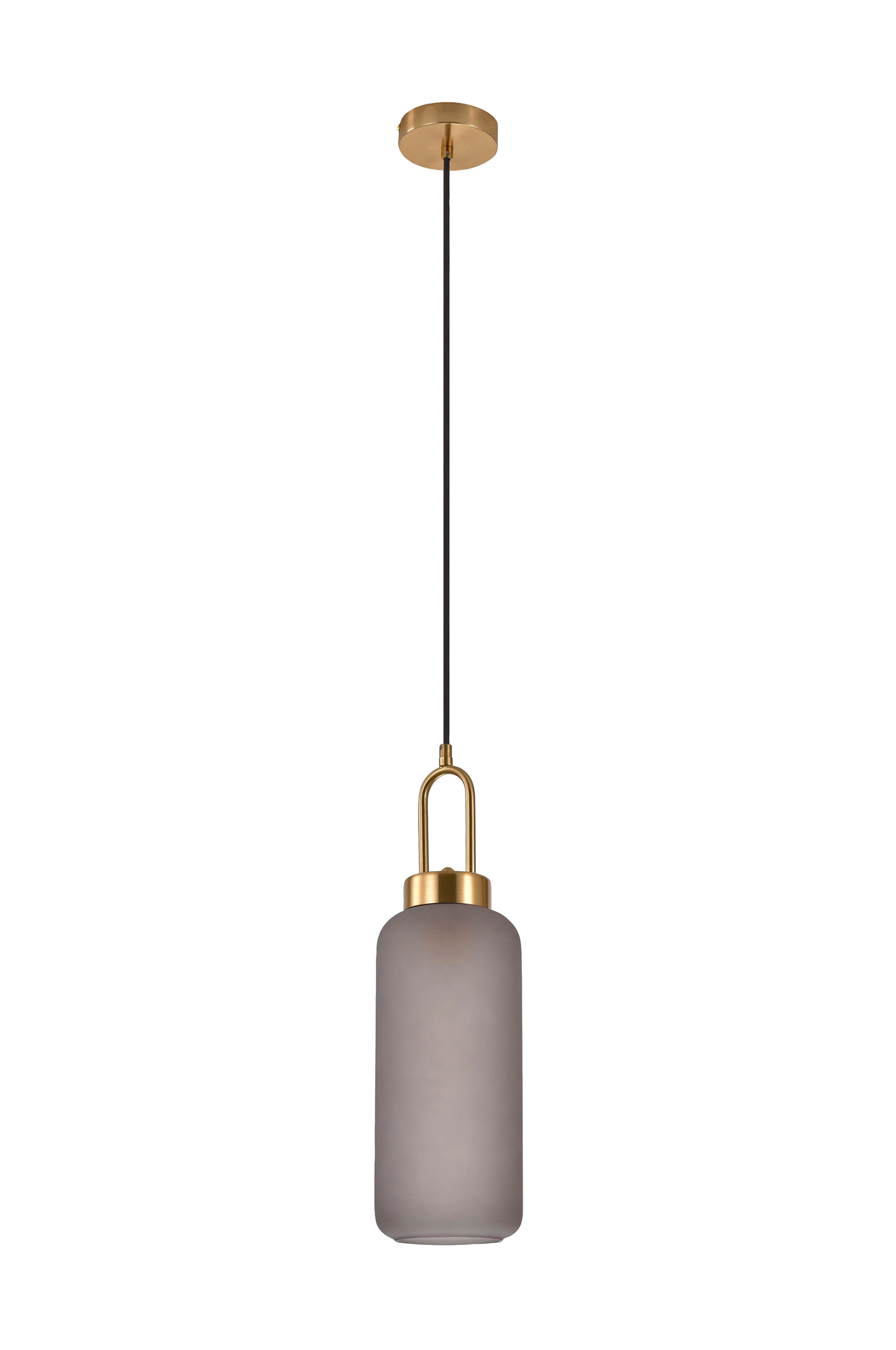 Lasinen kattovalaisin, jossa messinginvärinen kanta. Sylinterin mallinen, halkaisija 13 cm, 150 cm:n kangasjohto