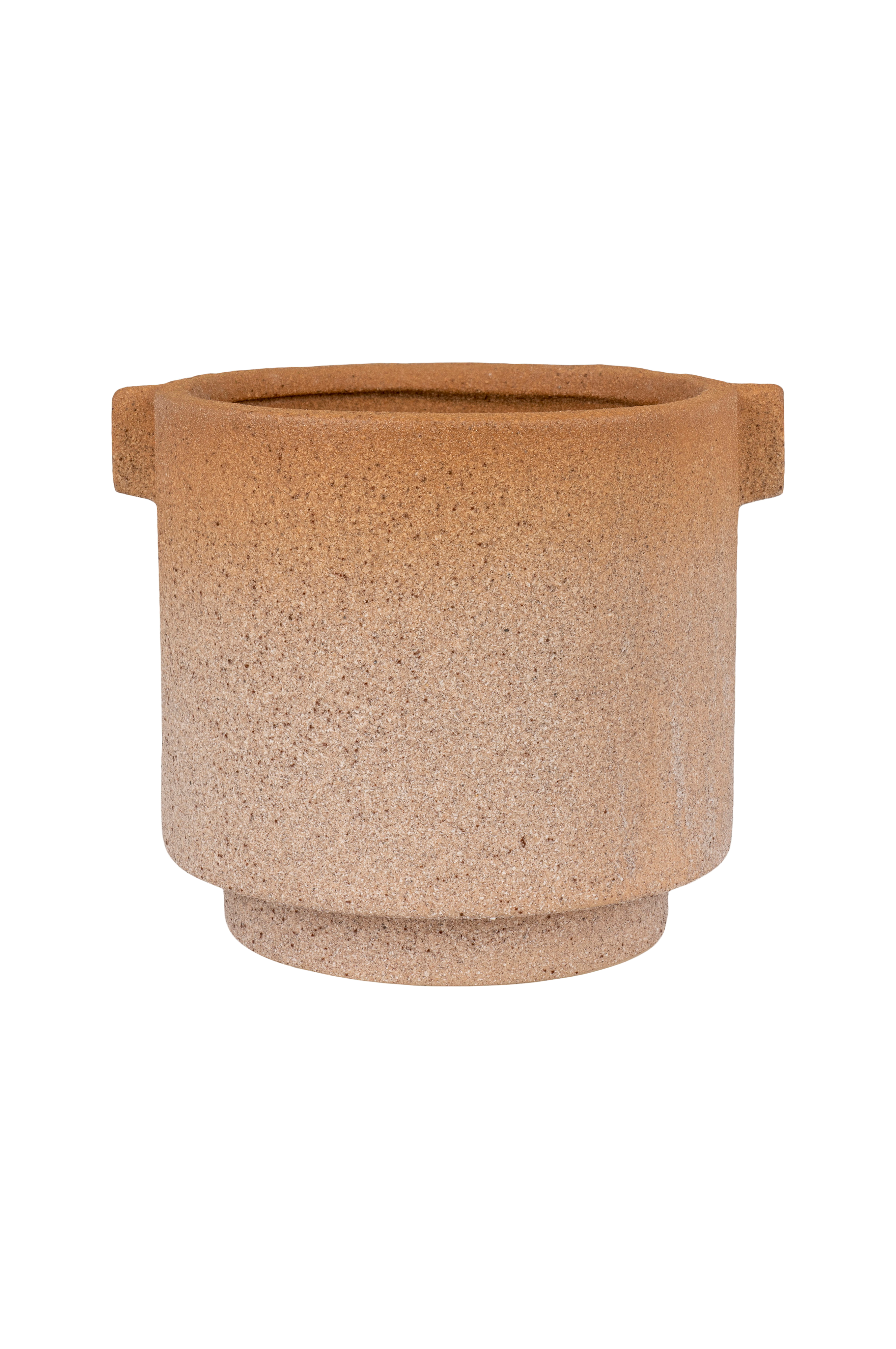 Pyöreä kukkaruukku ruskeanoranssia keramiikkaa, halkaisija 13x13 cm.