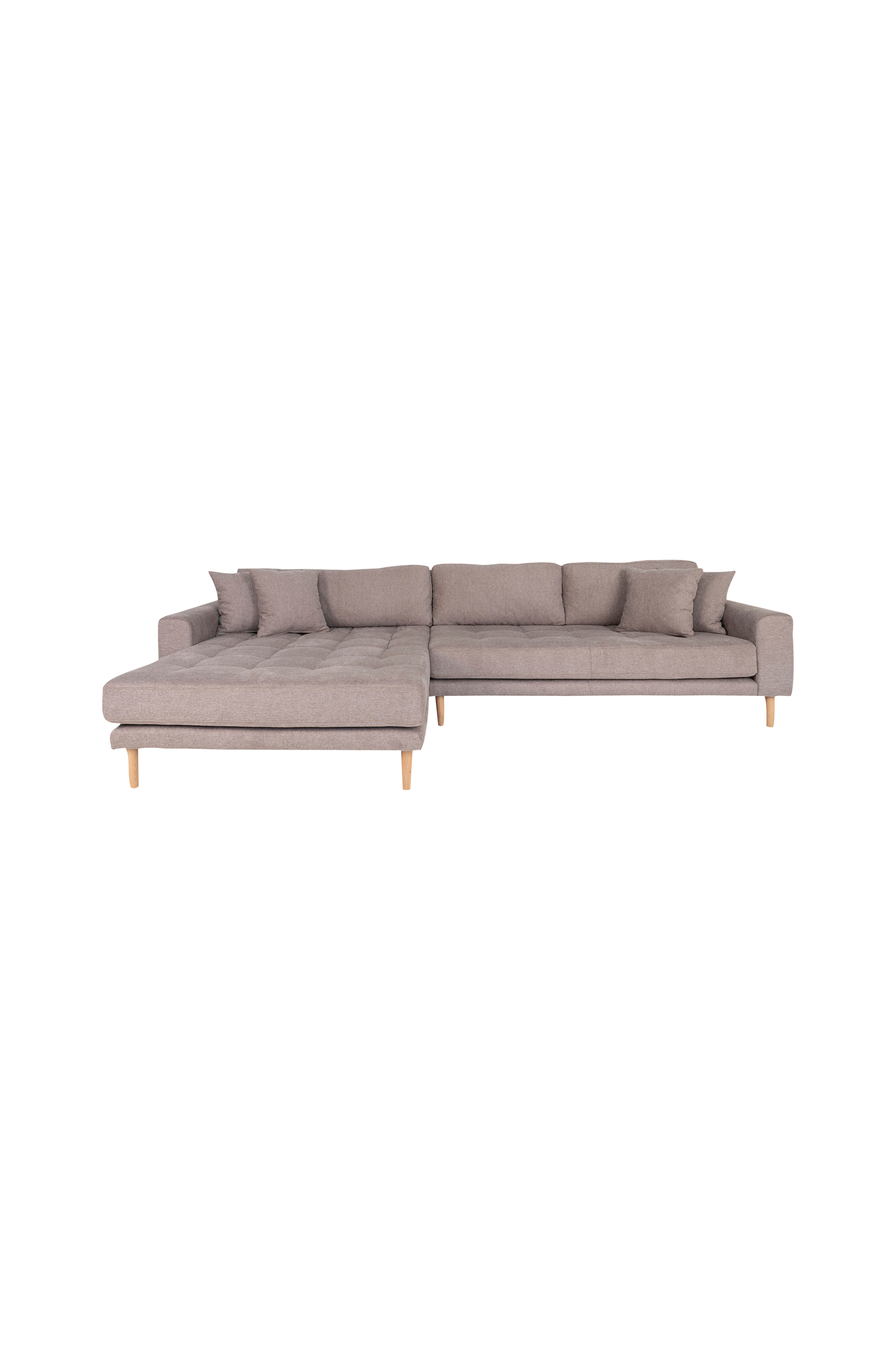 Vasenkätinen sohva, jossa Stone-värinen verhoilu ja neljä tyynyä