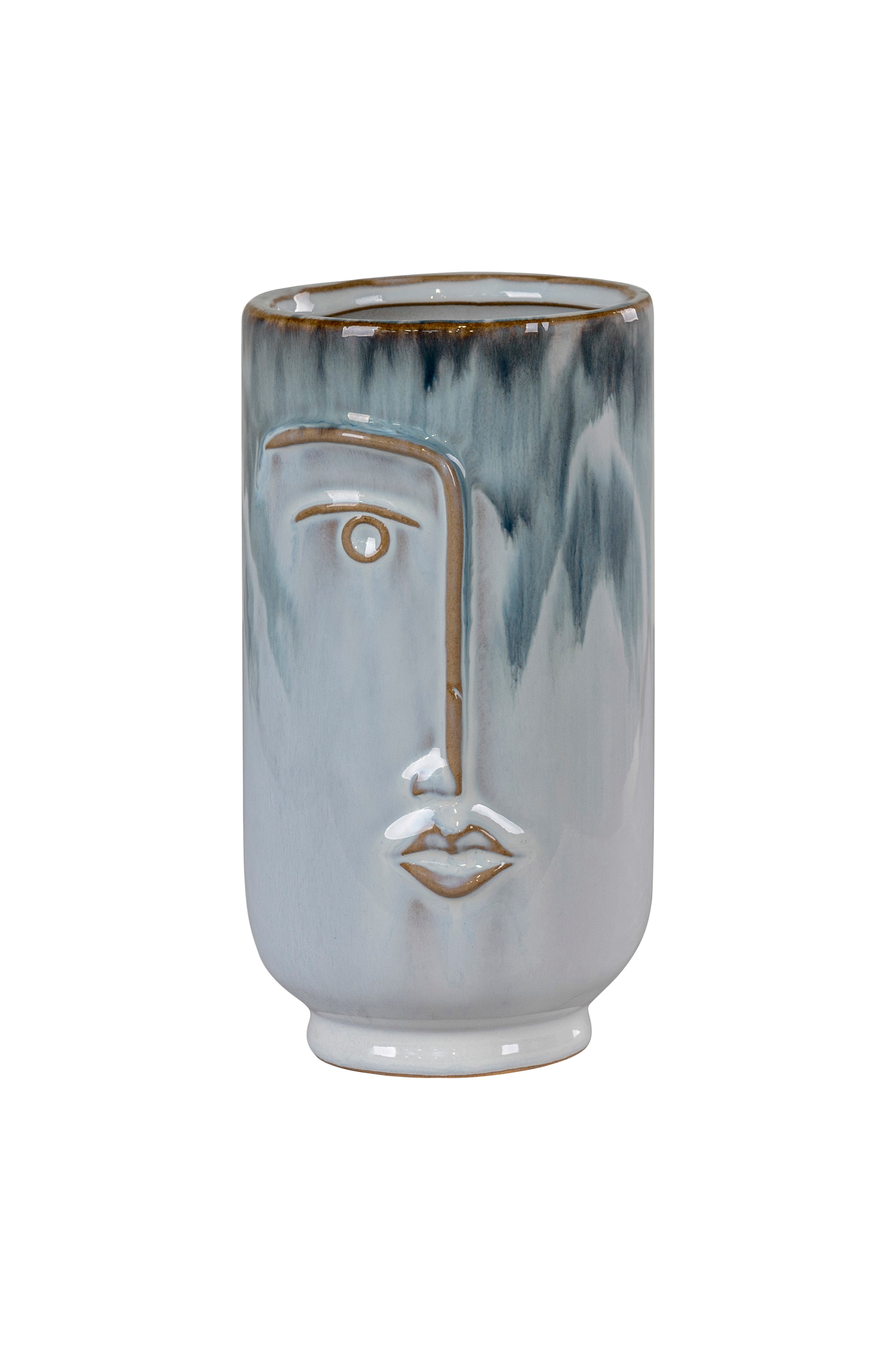 Pyöreä keramiikkamaljakko, jossa kasvot. Kaksi sinisen sävyä, halkaisija 9,5x17 cm.