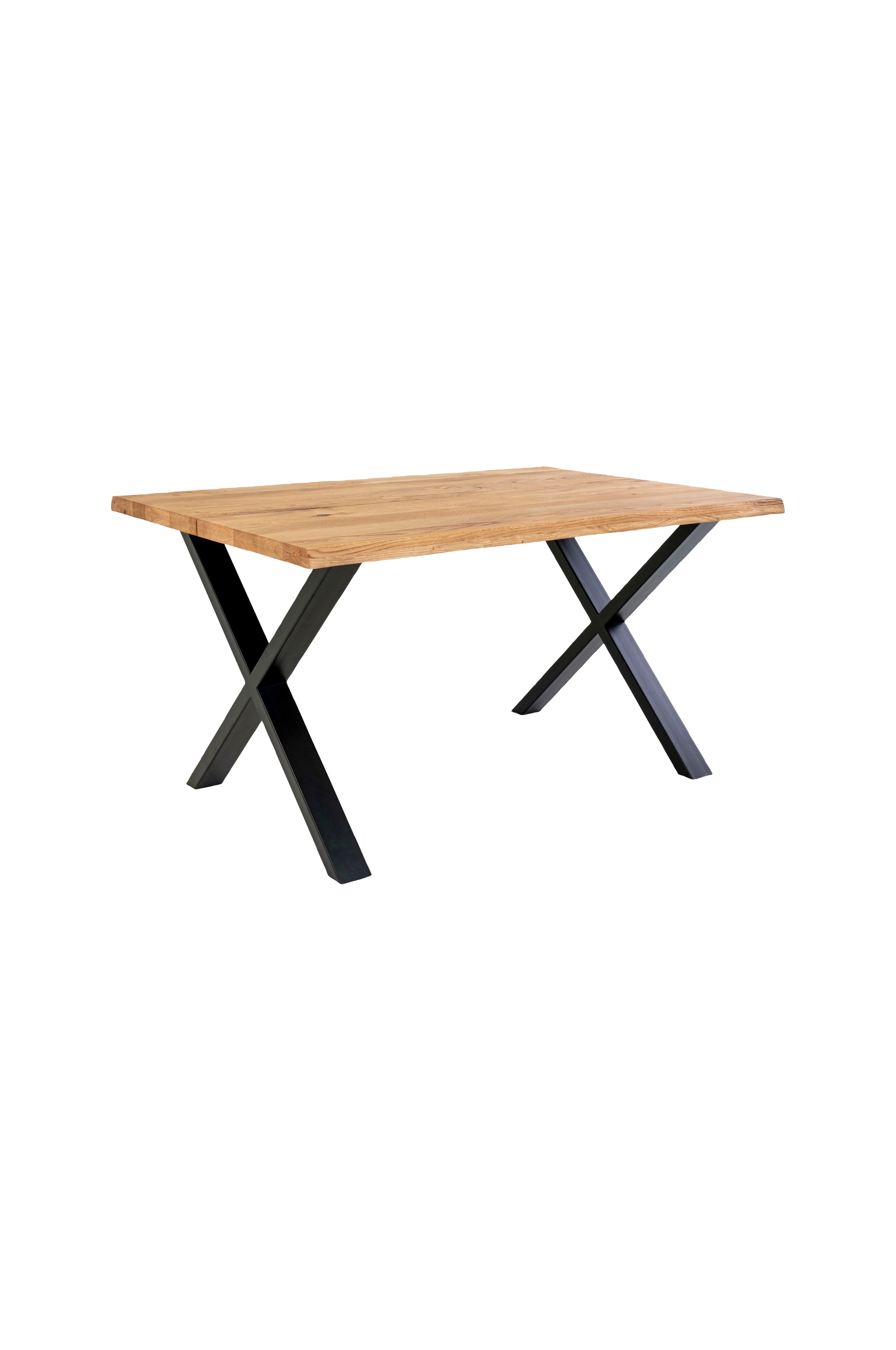 Ruokapöytä öljyttyä tammea. Aaltomaiset reunat ja teräsjalat.