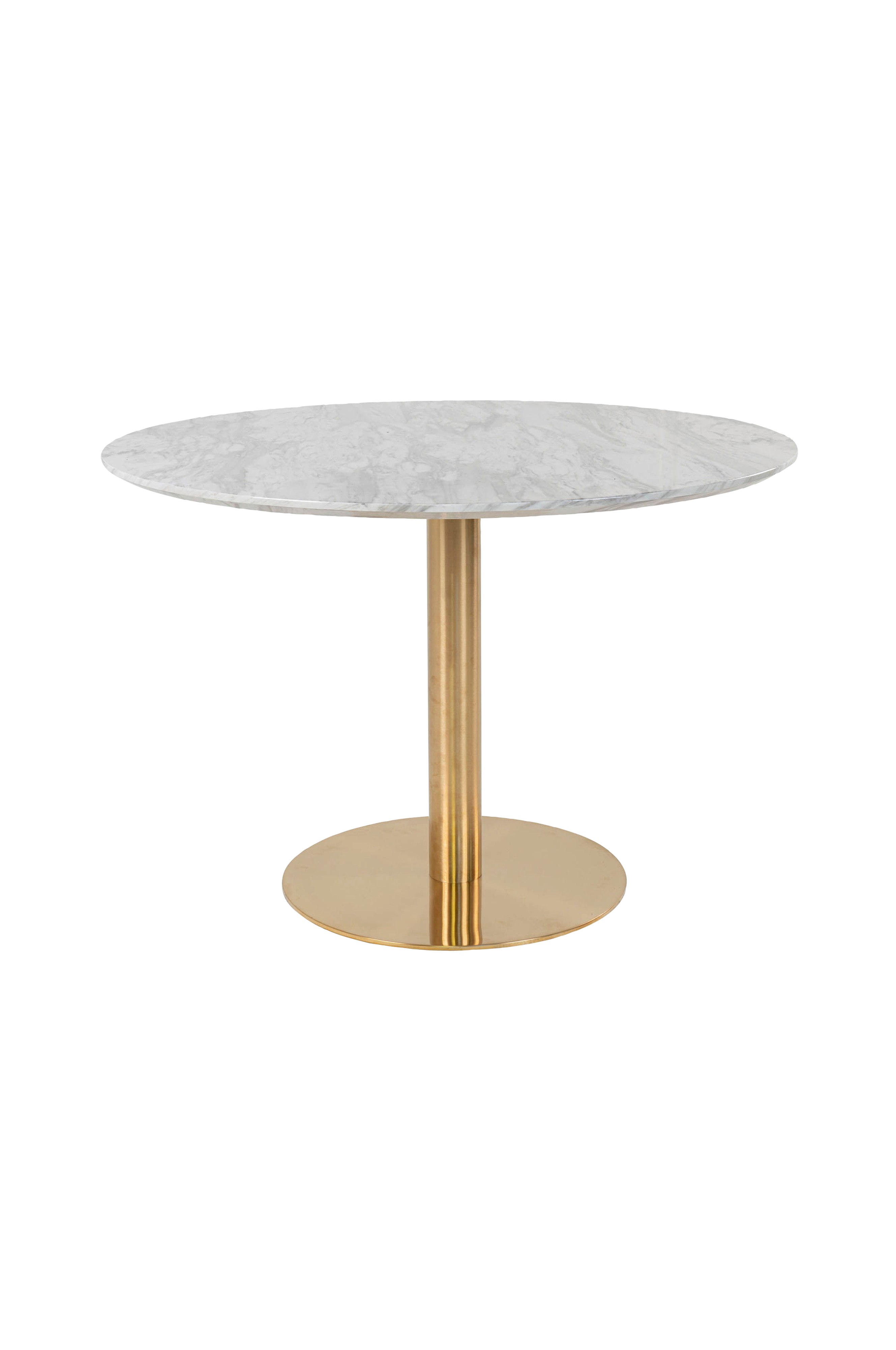 Ruokapöytä, jossa marmorimainen pöytälevy ja messinginvärinen jalka.