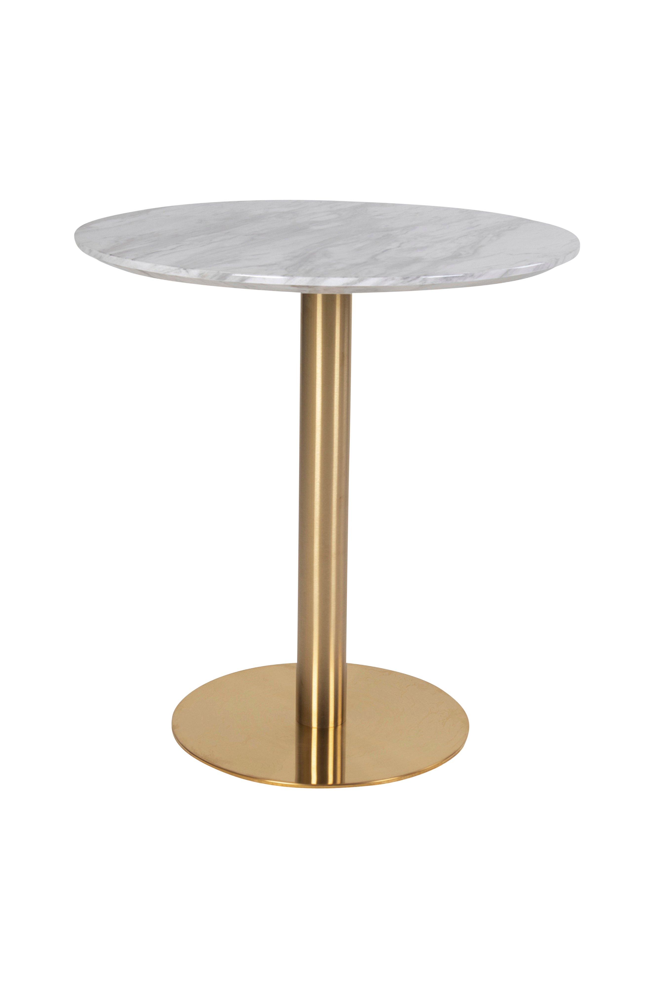 Ruokapöytä, jossa marmorimainen pöytälevy ja messinginvärinen jalka.