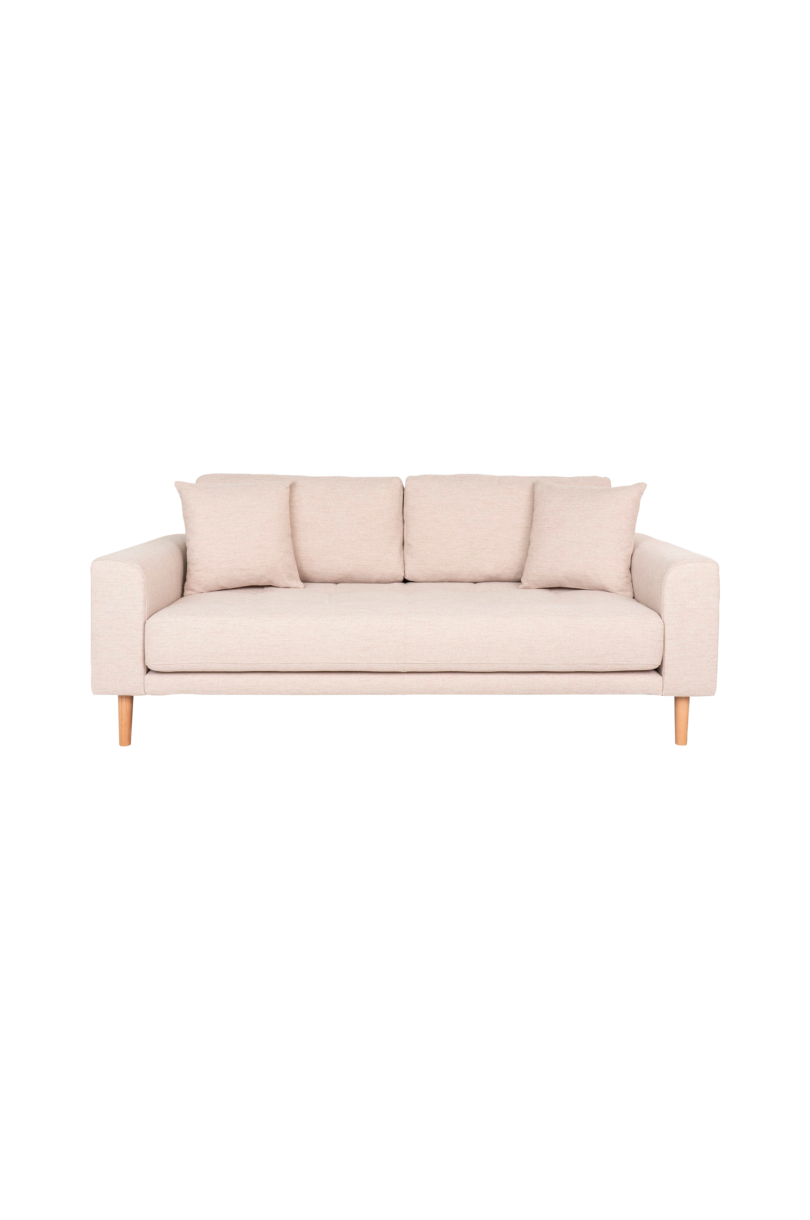 2,5:n istuttava sohva, jossa kaksi tyynyä ja luonnonväriset puujalat.