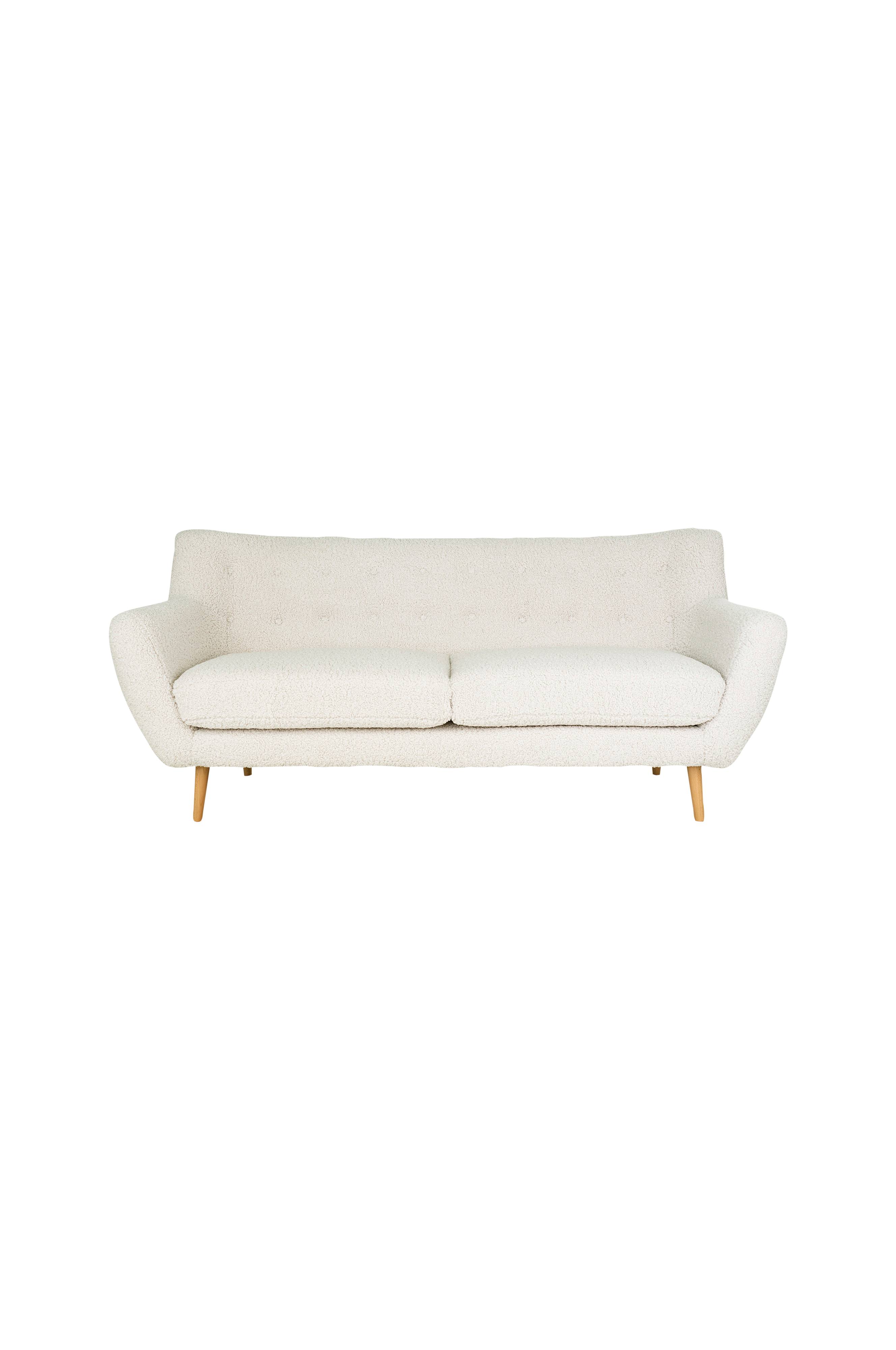3:n istuttava sohva lampaankarvajäljitelmää. Luonnonväriset jalat.