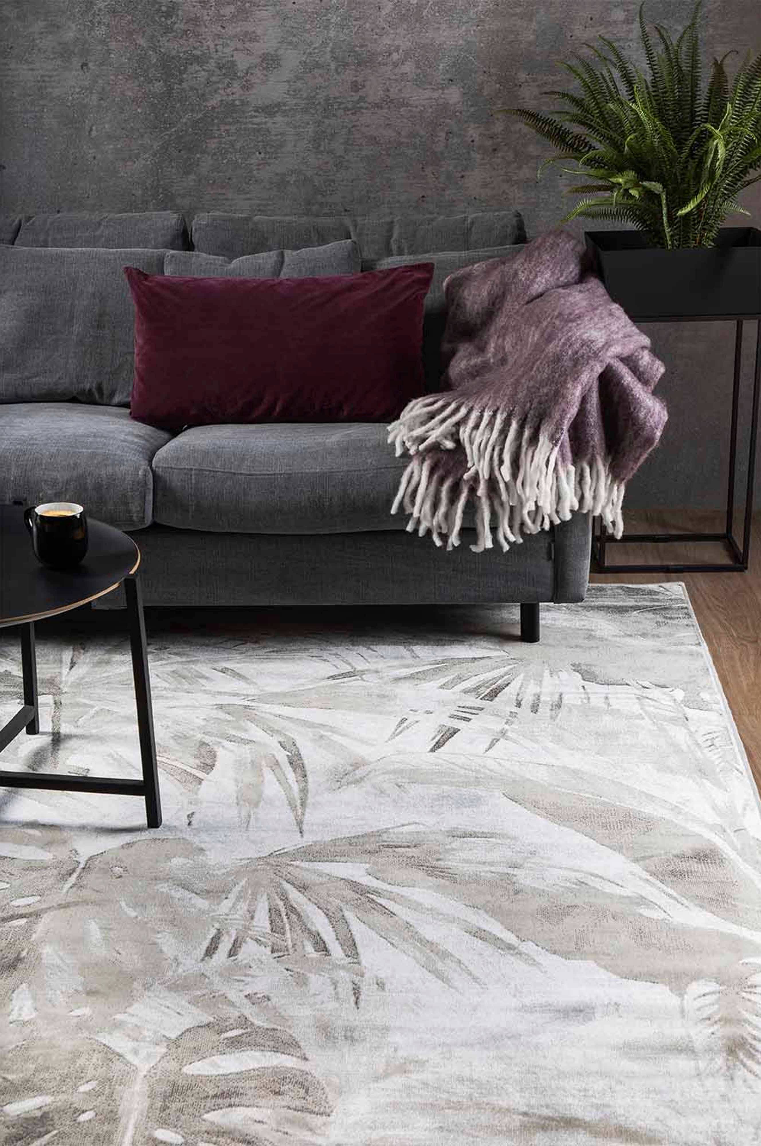 Viskoosimatto, jossa kaunis hohto. Matossa on kaunis trooppinen lehtikuvio pehmeissä sävyissä. Lyhyt nukka pehmeää ja sileää viskoosia, jonka ansiosta matto on helppohoitoinen ja helppo imuroida. Sopii makuuhuoneeseen tai sohvan viereen olohuoneeseen.