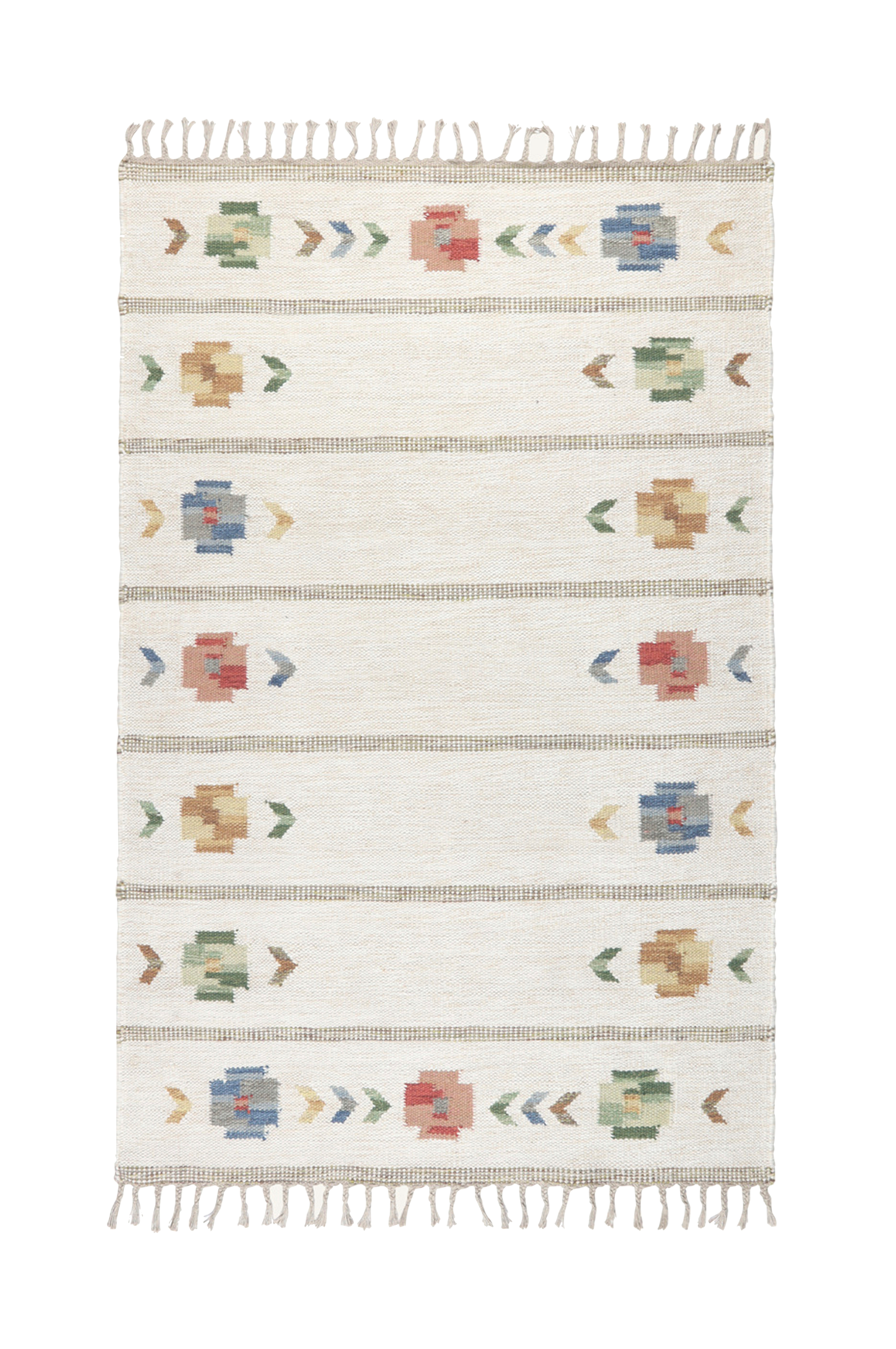 Käsinkudottu röllakan-villamatto. Matossa on vaalea pohja ja reunoissa kukkakuvio. Kauniisti kuvioidussa matossa on raikkaat värit, ja matto sopii sekä perinteiseen että moderniin kotiin. Villa on luonnostaan kestävä ja helppohoitoinen materiaali.